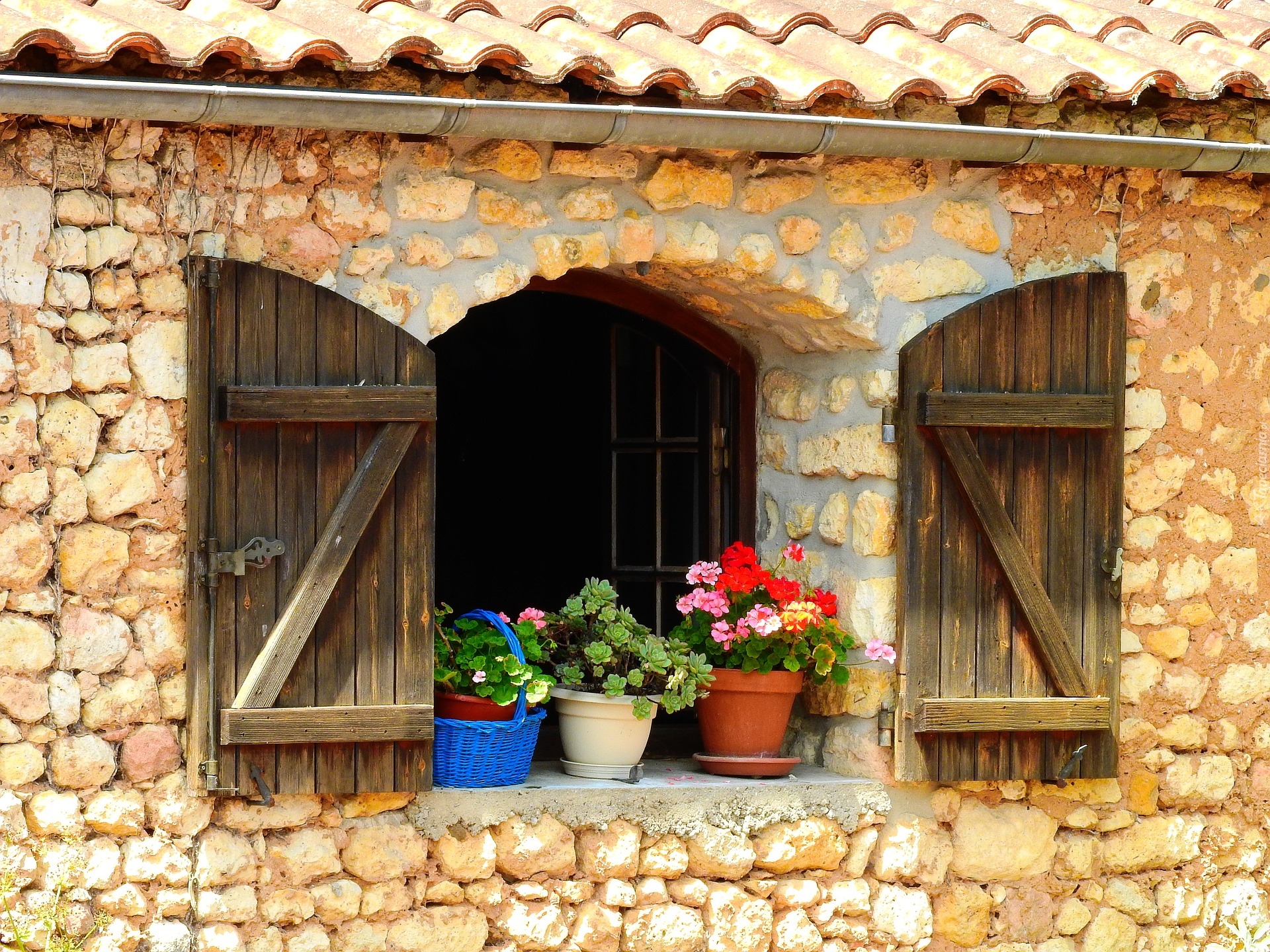 Edytor tapety: Otwarte okiennice i kwiaty w donicach na murku