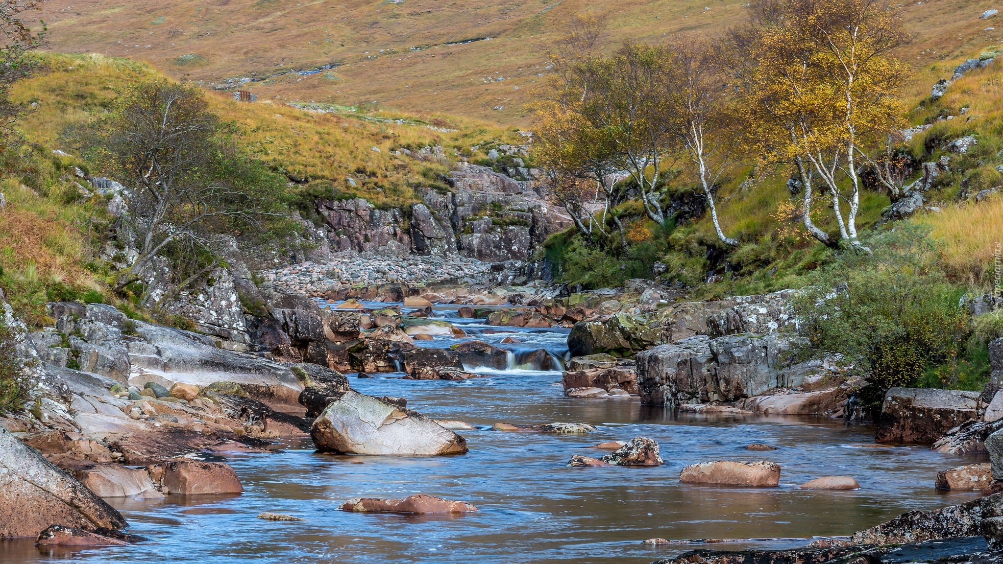 Edytor tapety: Brzozy na kamienistym brzegu rzeki