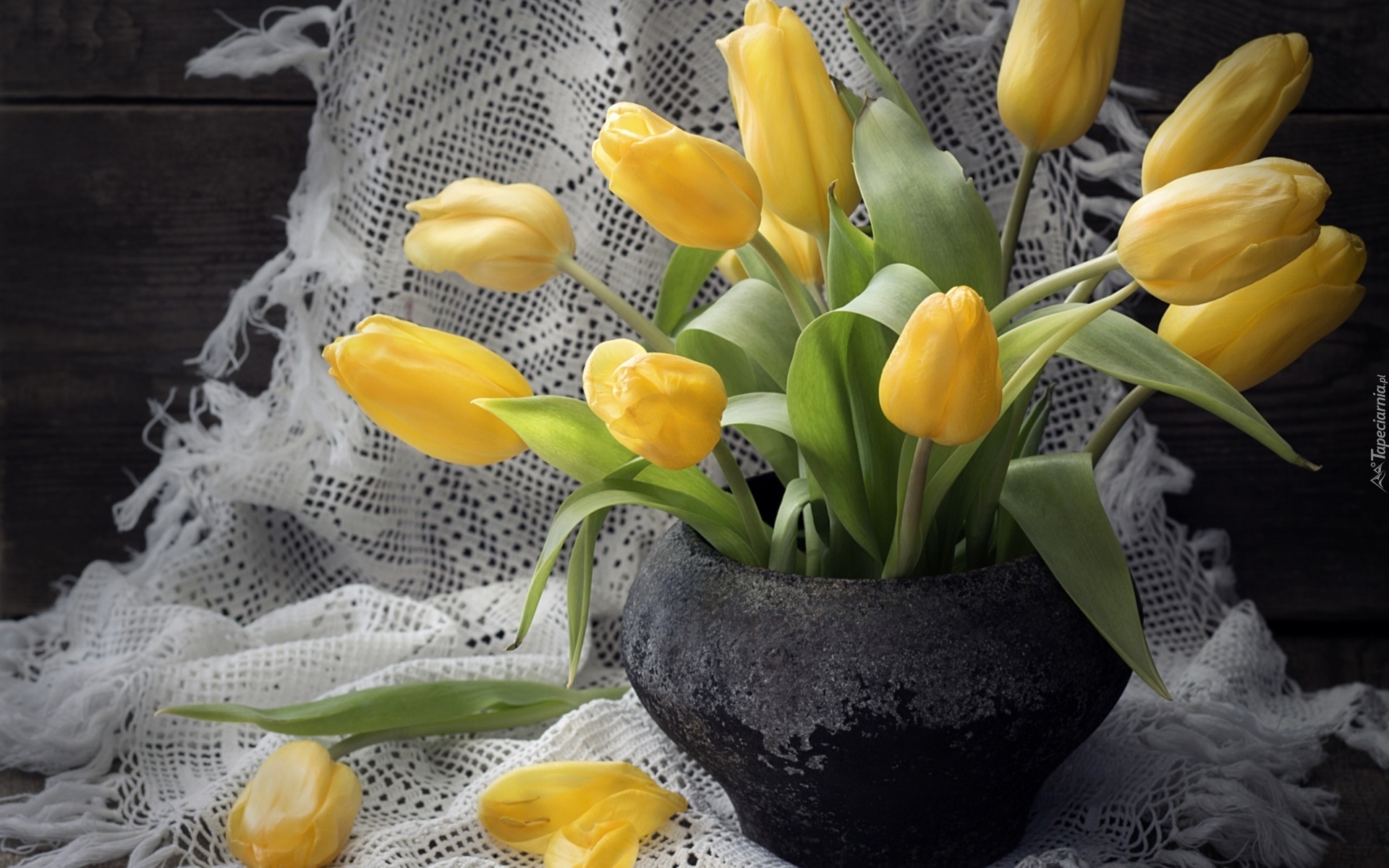 Edytor tapety: Żółte tulipany w ciemnym wazonie na serwecie