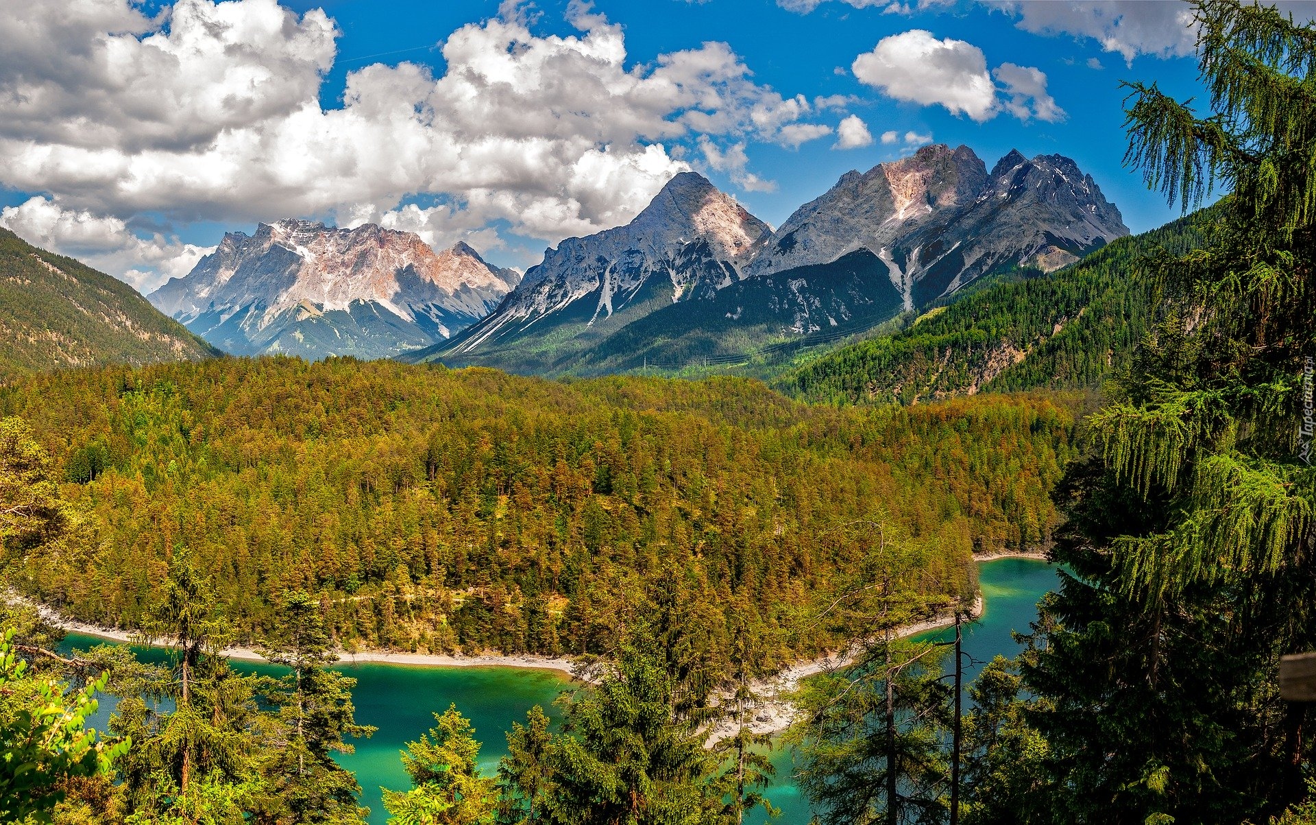 Edytor tapety: Jezioro Blindsee i widok na lasy i góry