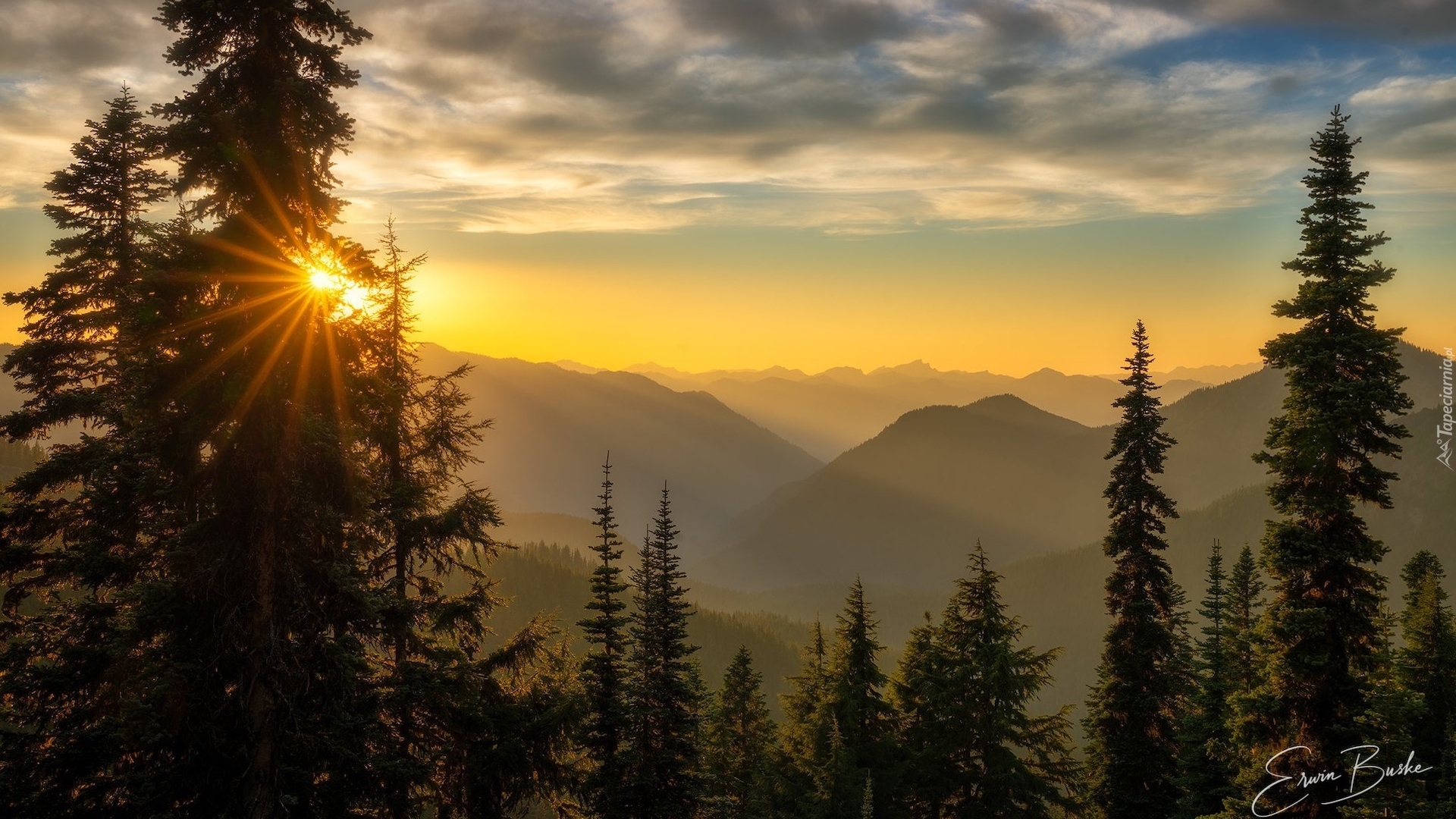 Edytor tapety: Drzewa i góry w promieniach słońca
