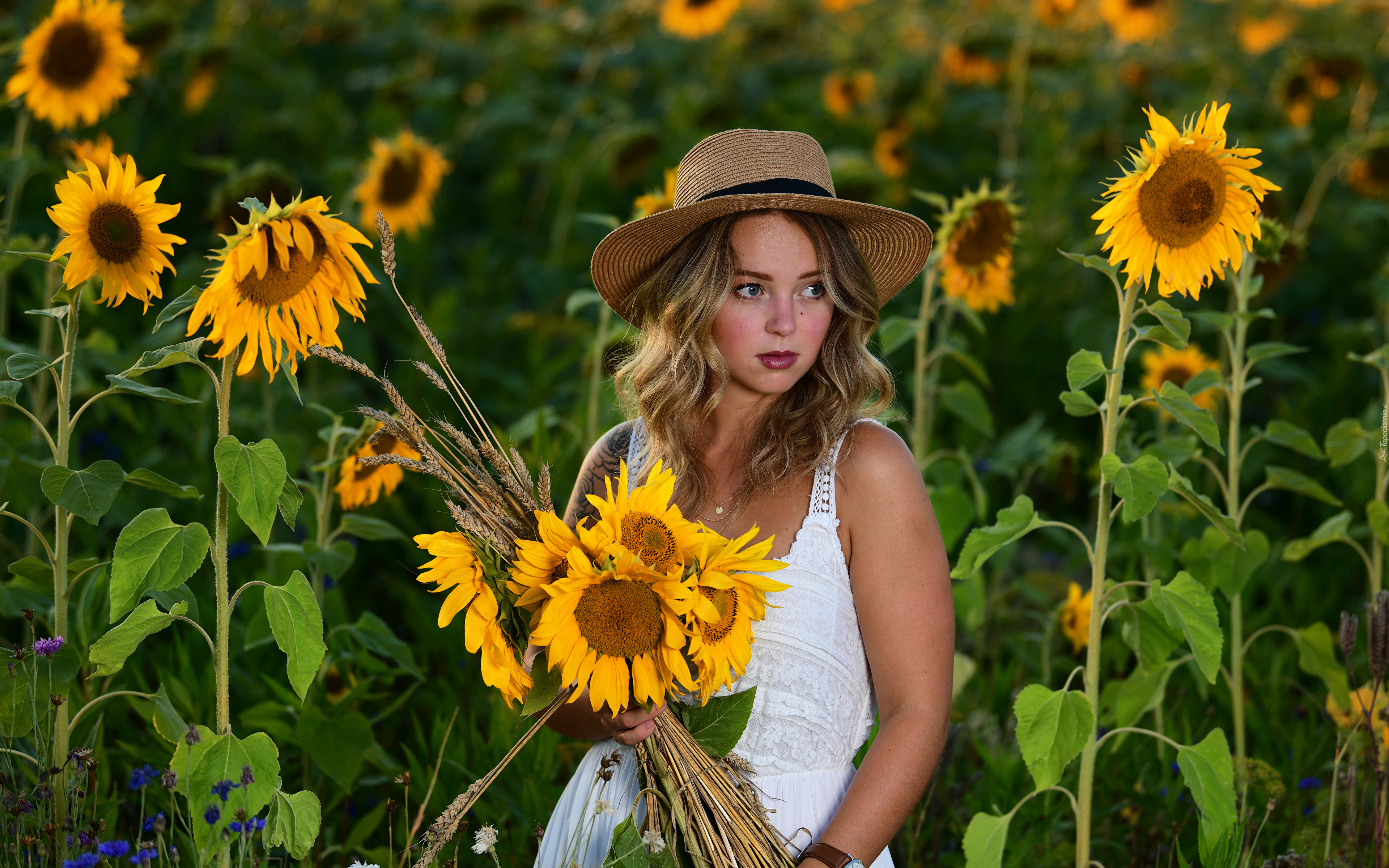 Edytor tapety: Kobieta w kapeluszu z kwiatami na słonecznikowym polu