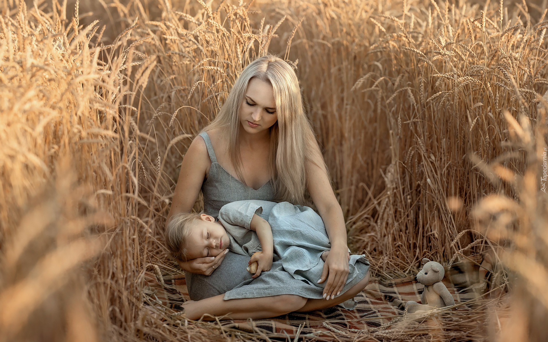 Edytor tapety: Kobieta ze śpiącą dziewczynką w zbożu