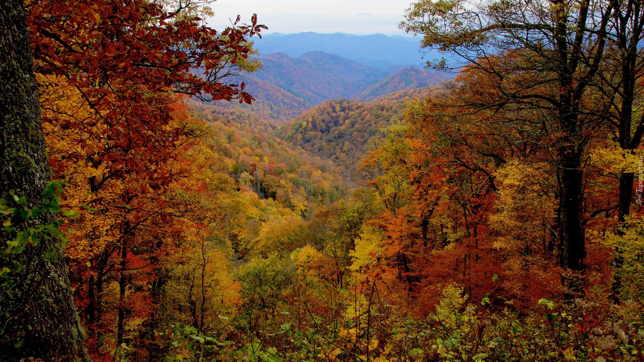 Edytor tapety: Widok na góry z jesiennego lasu
