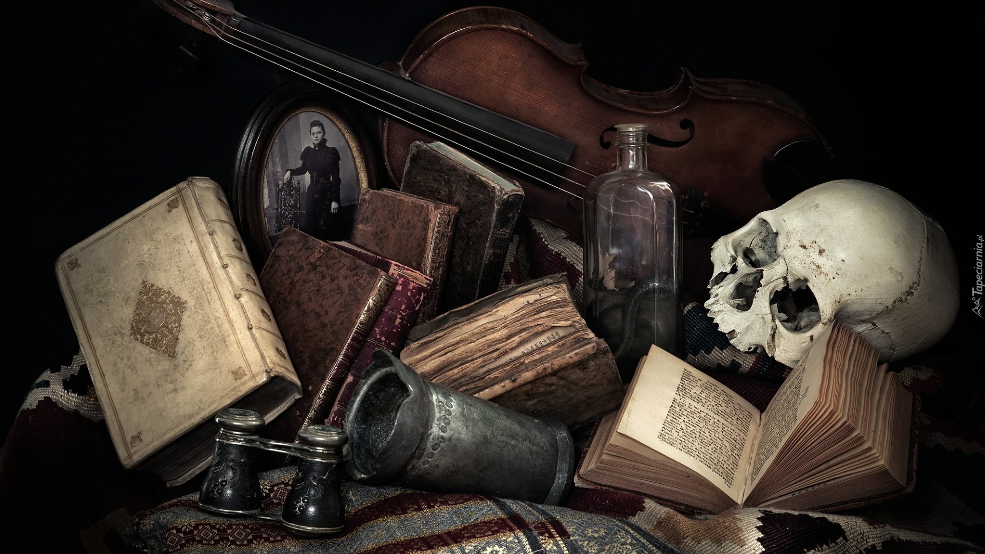 Edytor tapety: Stare książki obok skrzypiec i czaszki