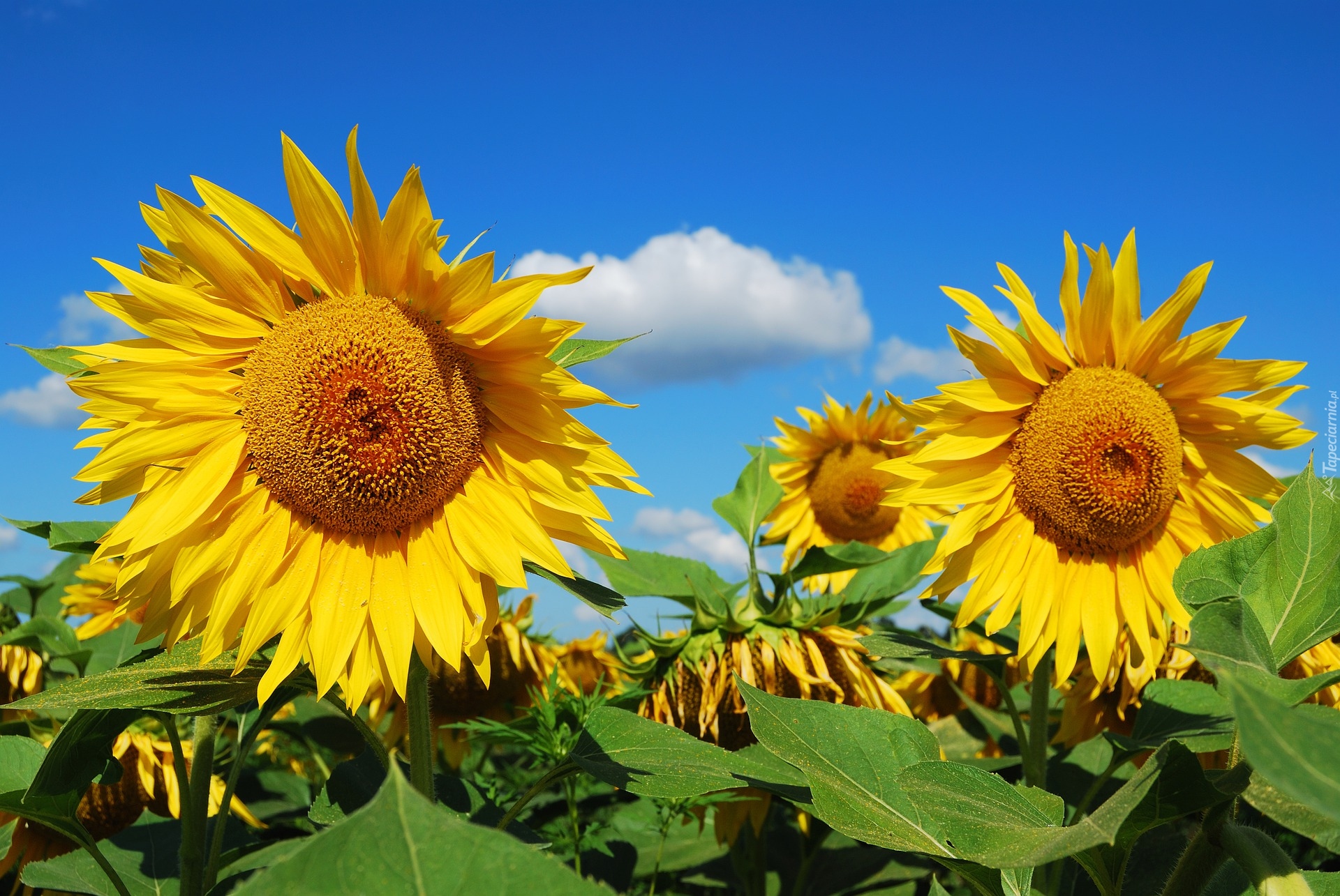 Edytor tapety: Kwitnące słoneczniki na tle błękitnego nieba