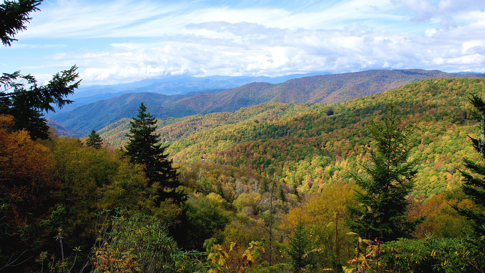 Edytor tapety: Panorama zalesionych gór jesienną porą