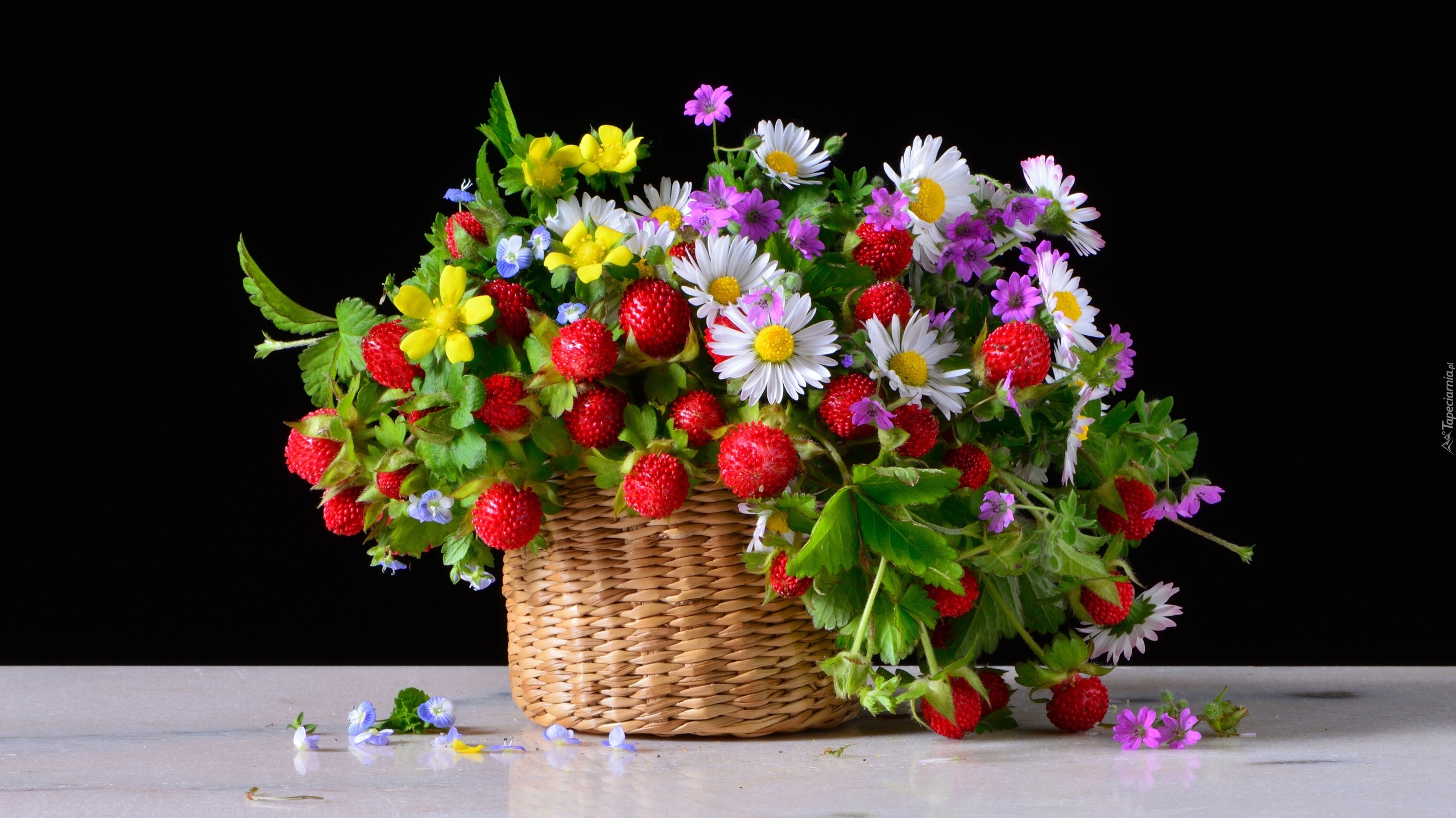 Edytor tapety: Kosz z poziomkami i polnymi kwiatami