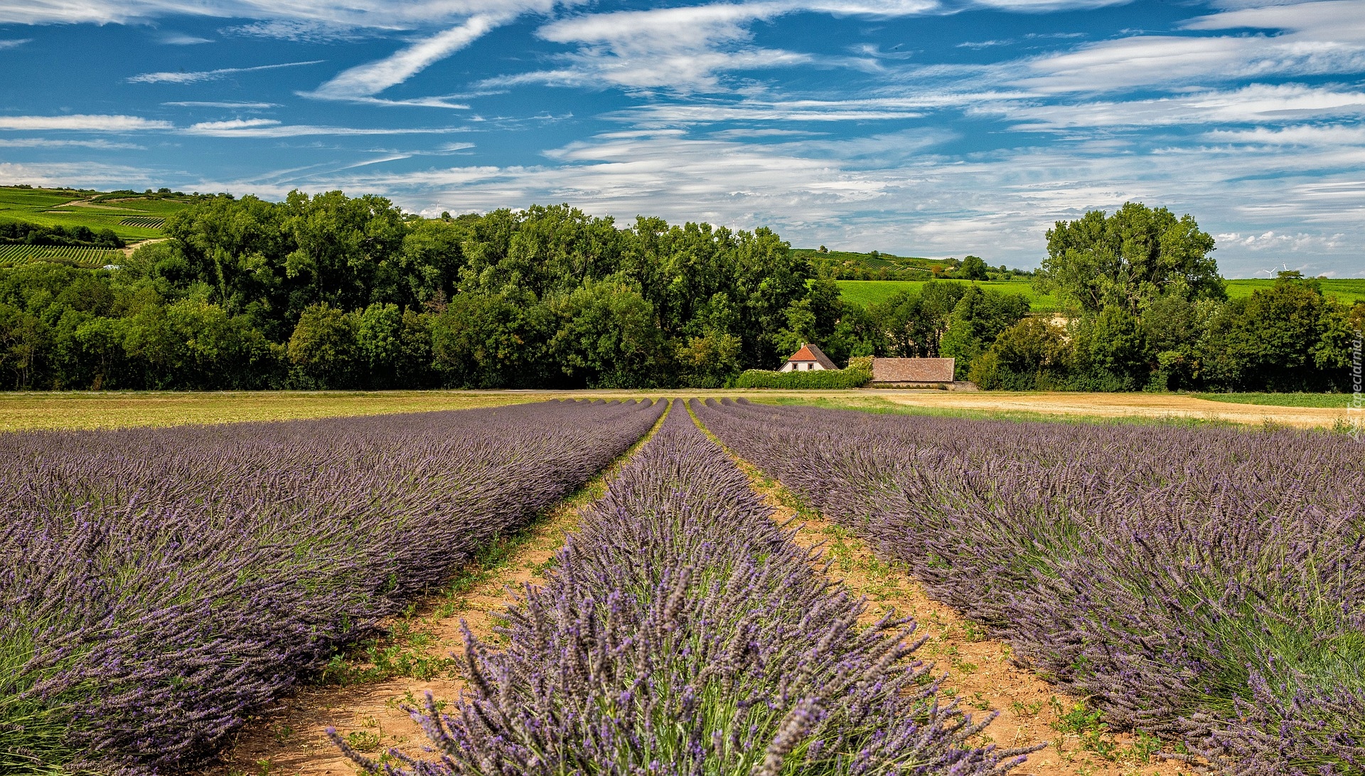 Edytor tapety: Pole lawendy obok zabudowań gospodarskich