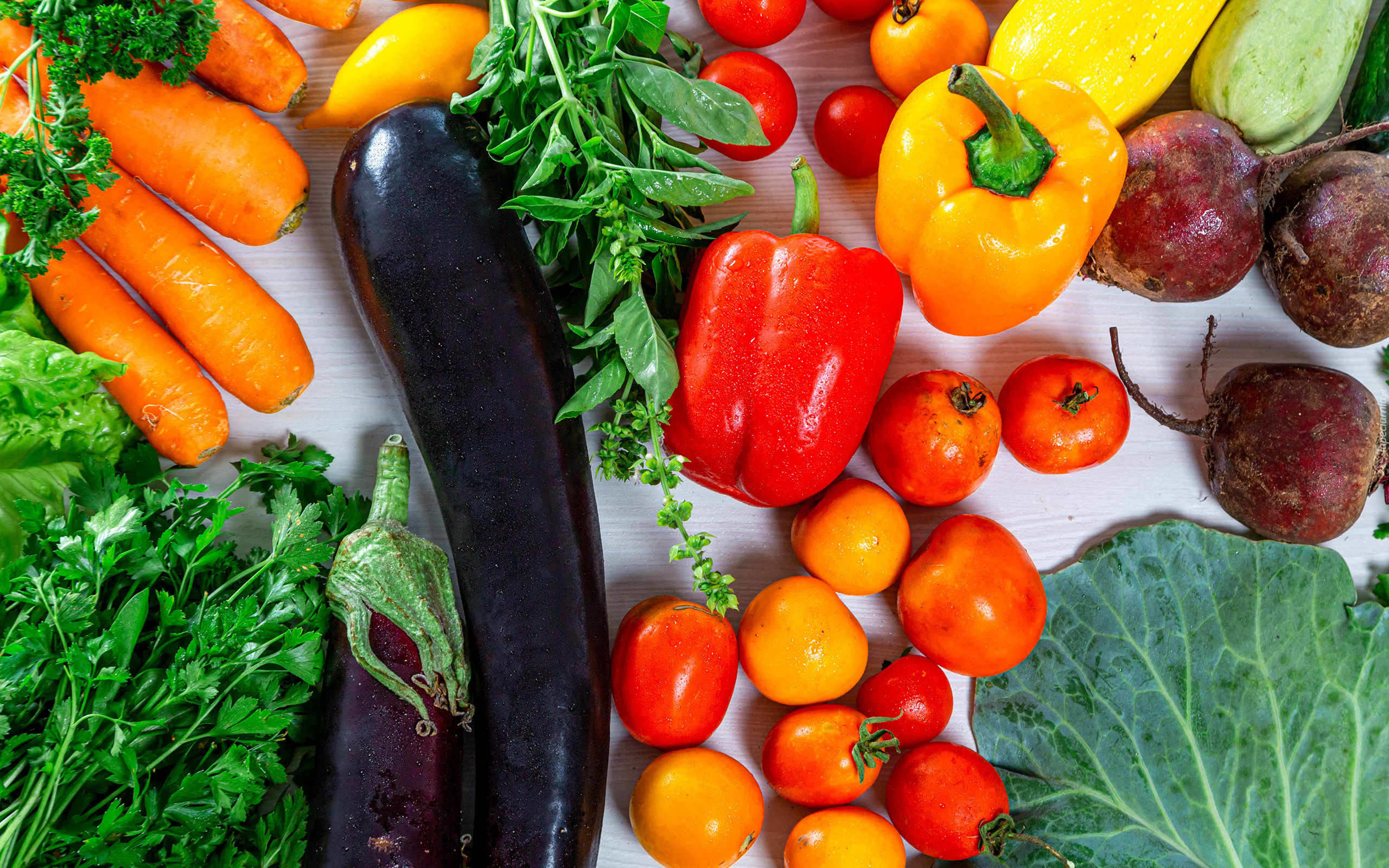 Edytor tapety: Bakłażany obok pomidorów i papryki