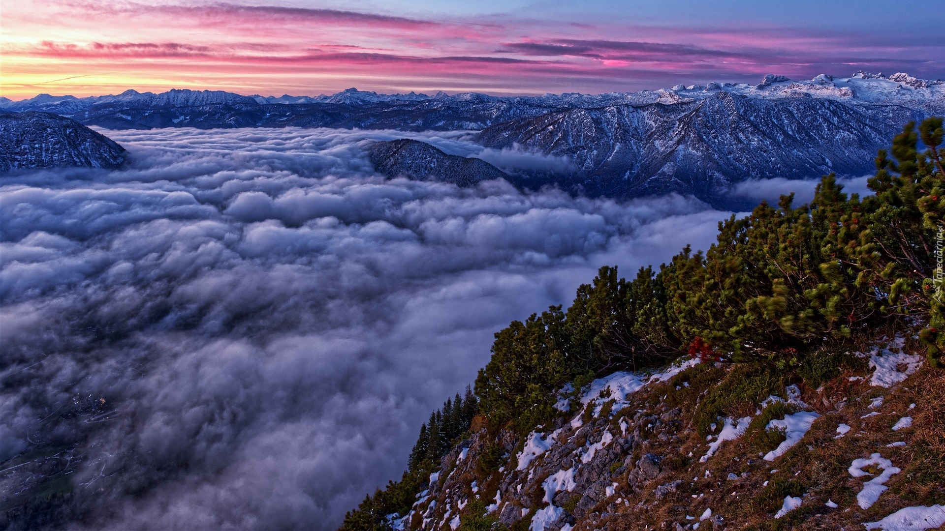 Edytor tapety: Gęsta mgła nad ośnieżonymi górami