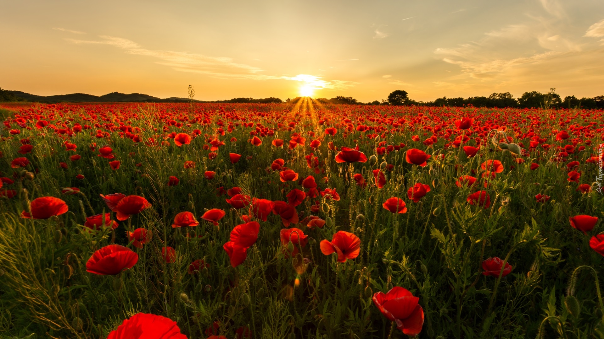 Edytor tapety: Wschód słońca nad makowym polem