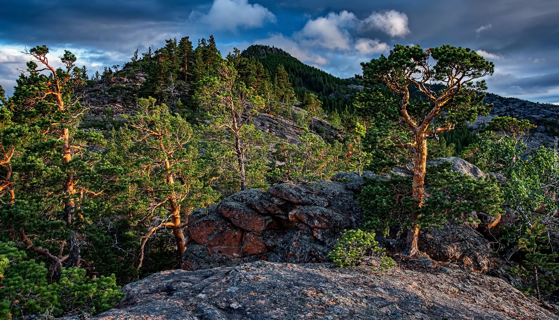 Edytor tapety: Drzewa iglaste na skałach w słońcu