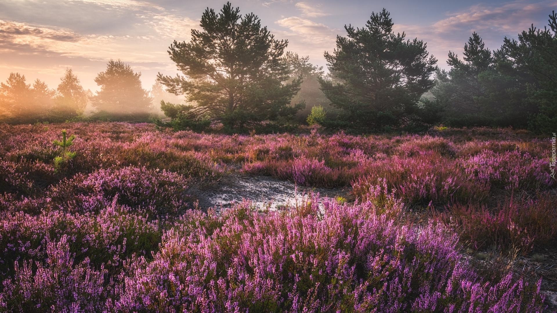 Edytor tapety: Mgła unosząca się nad drzewami na wrzosowisku