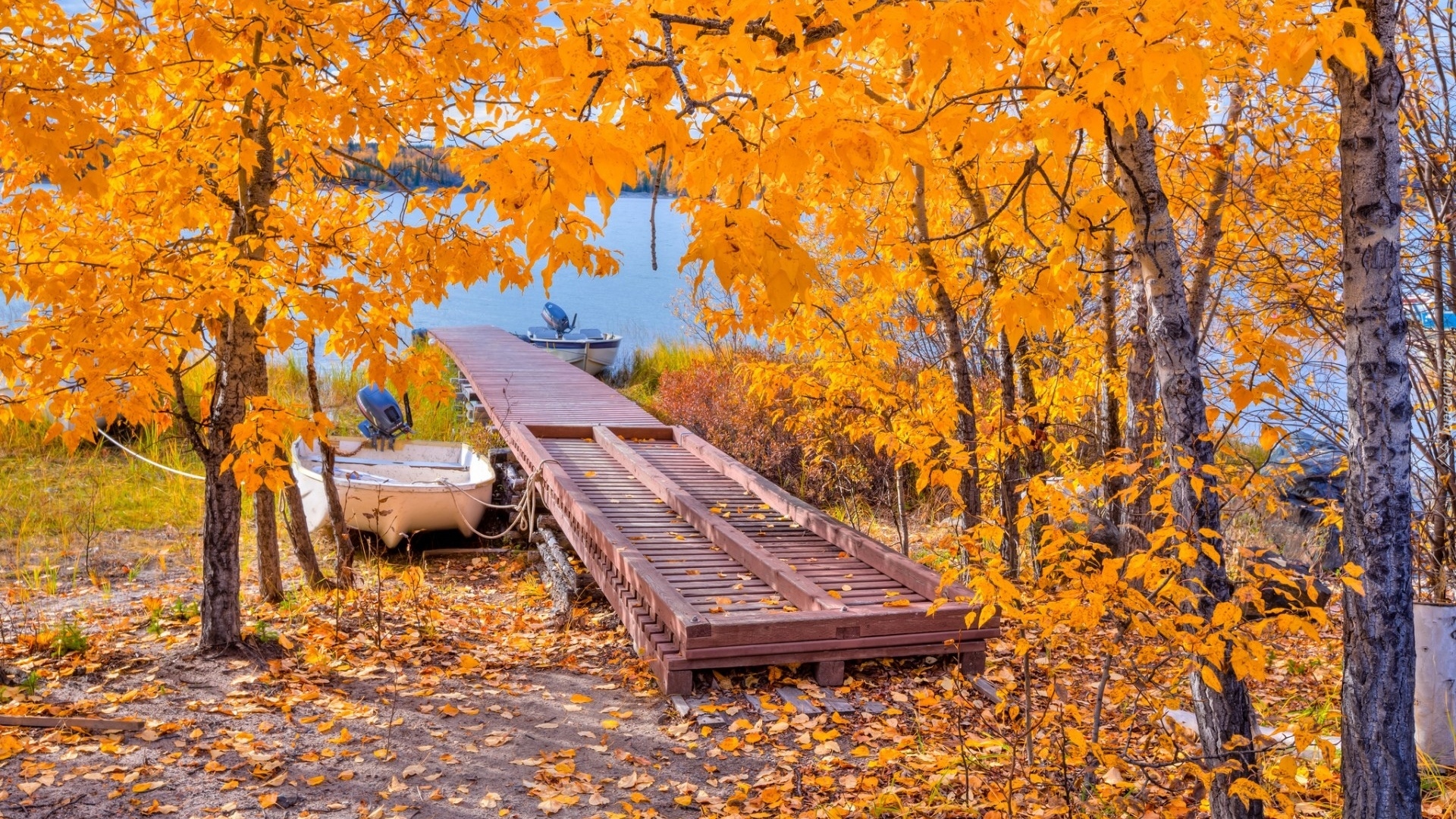 Edytor tapety: Łódki przy pomoście pośród brzóz