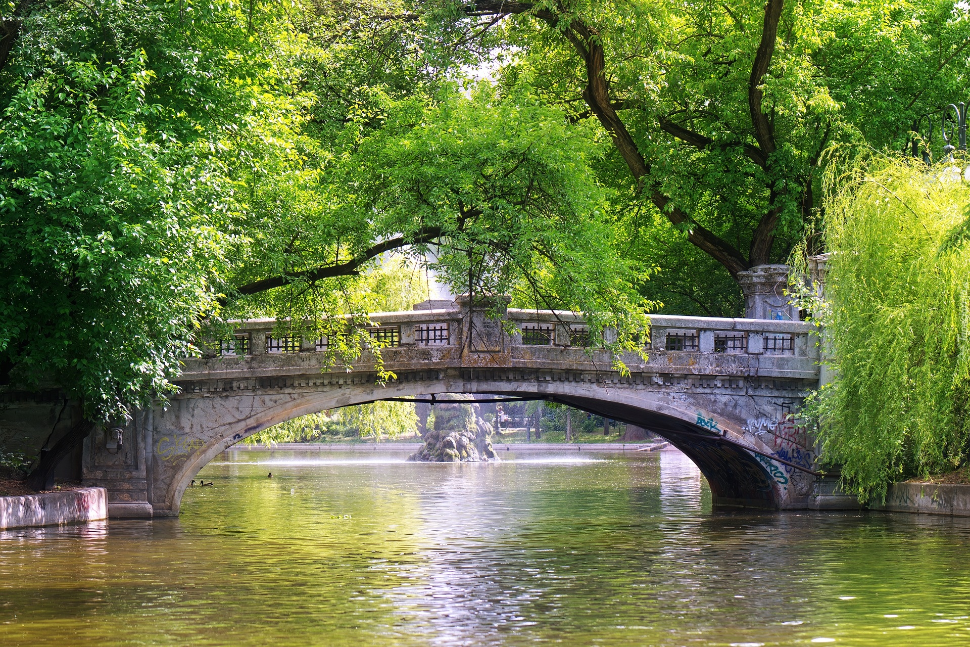 Edytor tapety: Most i zielone drzewa nad stawem