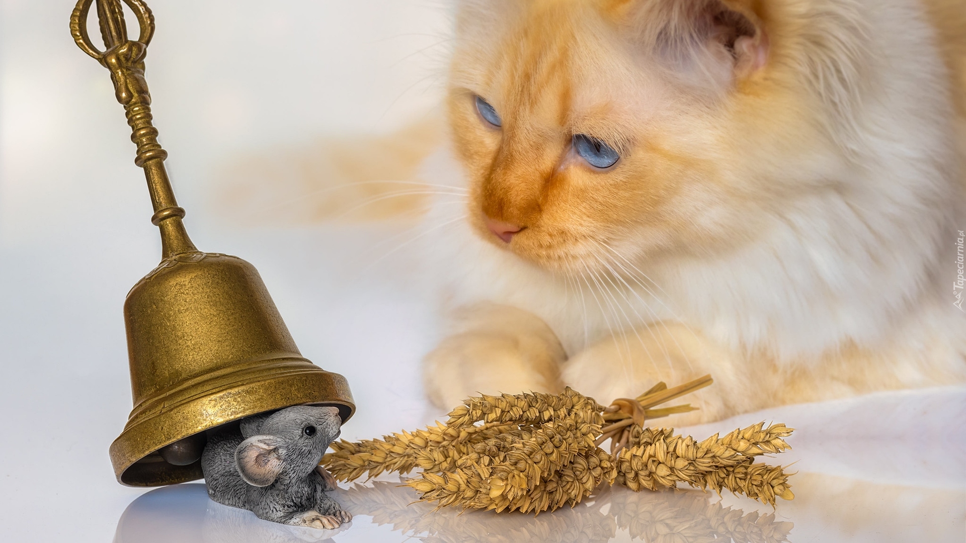 Edytor tapety: Niebieskooki kot obserwujący figurkę myszki pod dzwonkiem