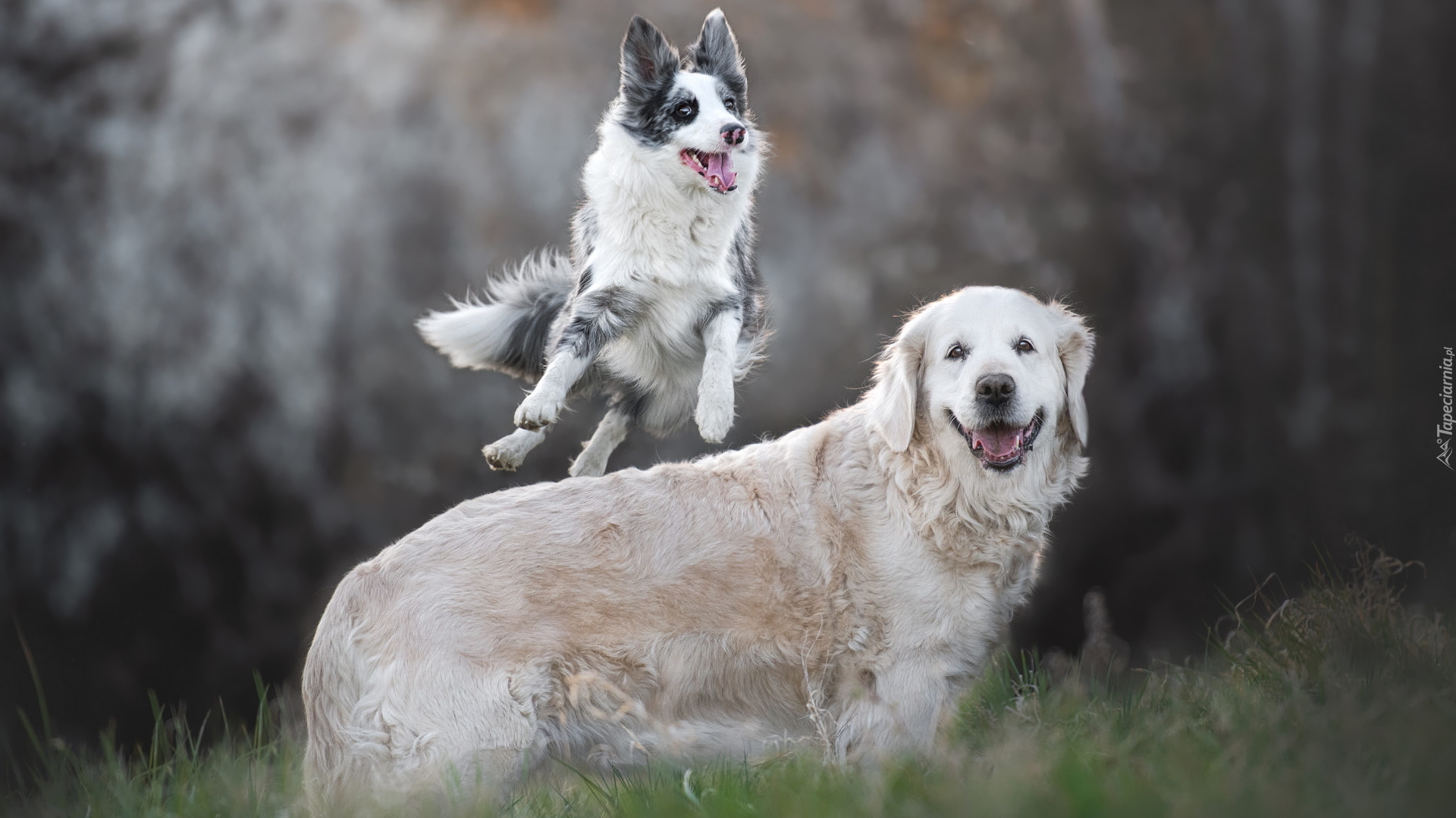 Edytor tapety: Border collie skaczacy przez golden retrievera