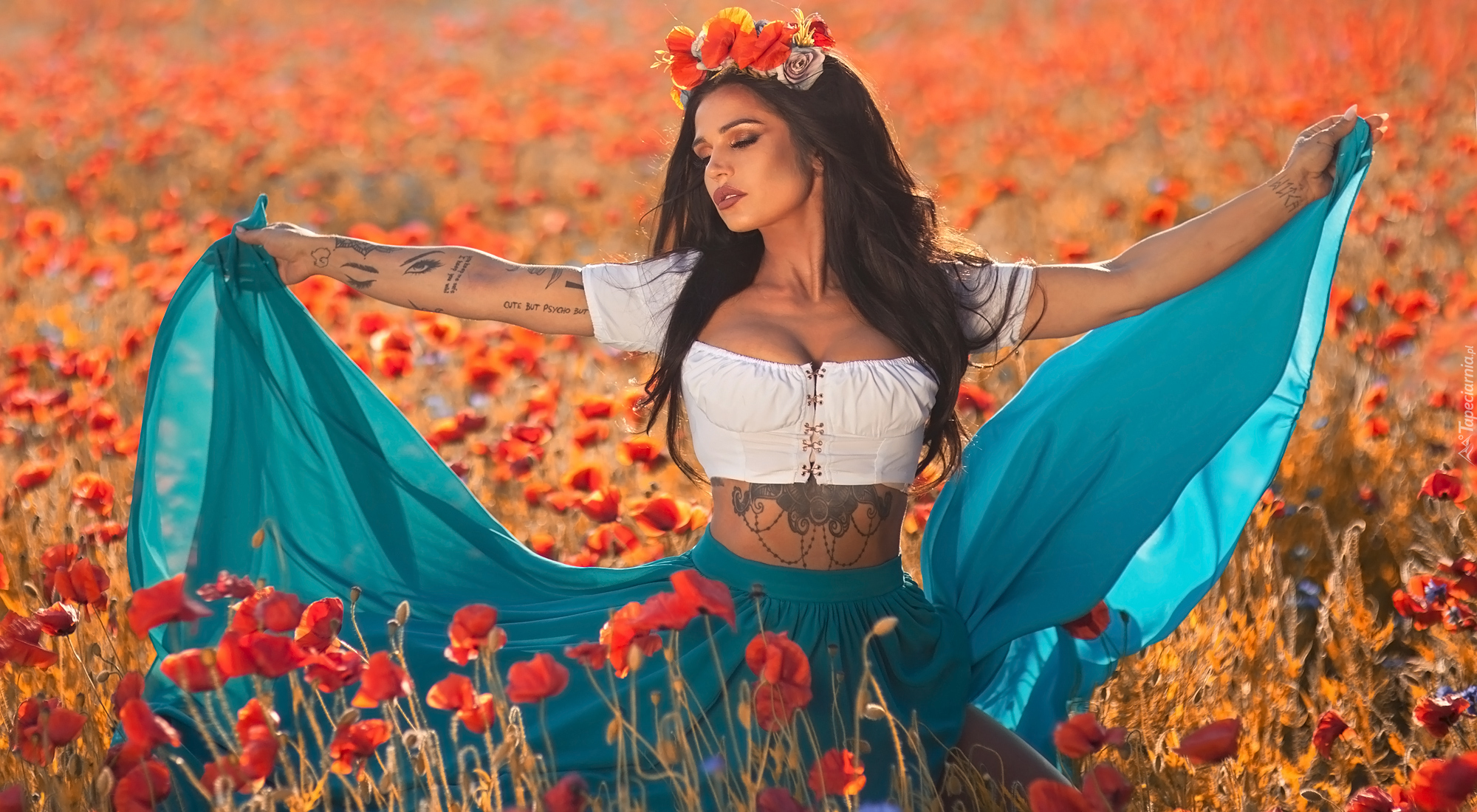 Edytor tapety: Kobieta z tatuażami wśród maków