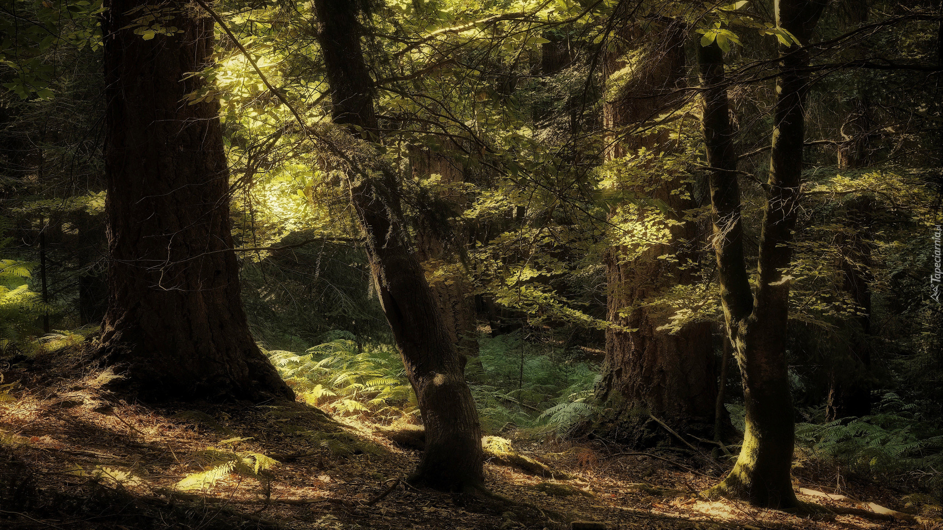 Edytor tapety: Paprocie po drzewami w rozświetlonym lesie