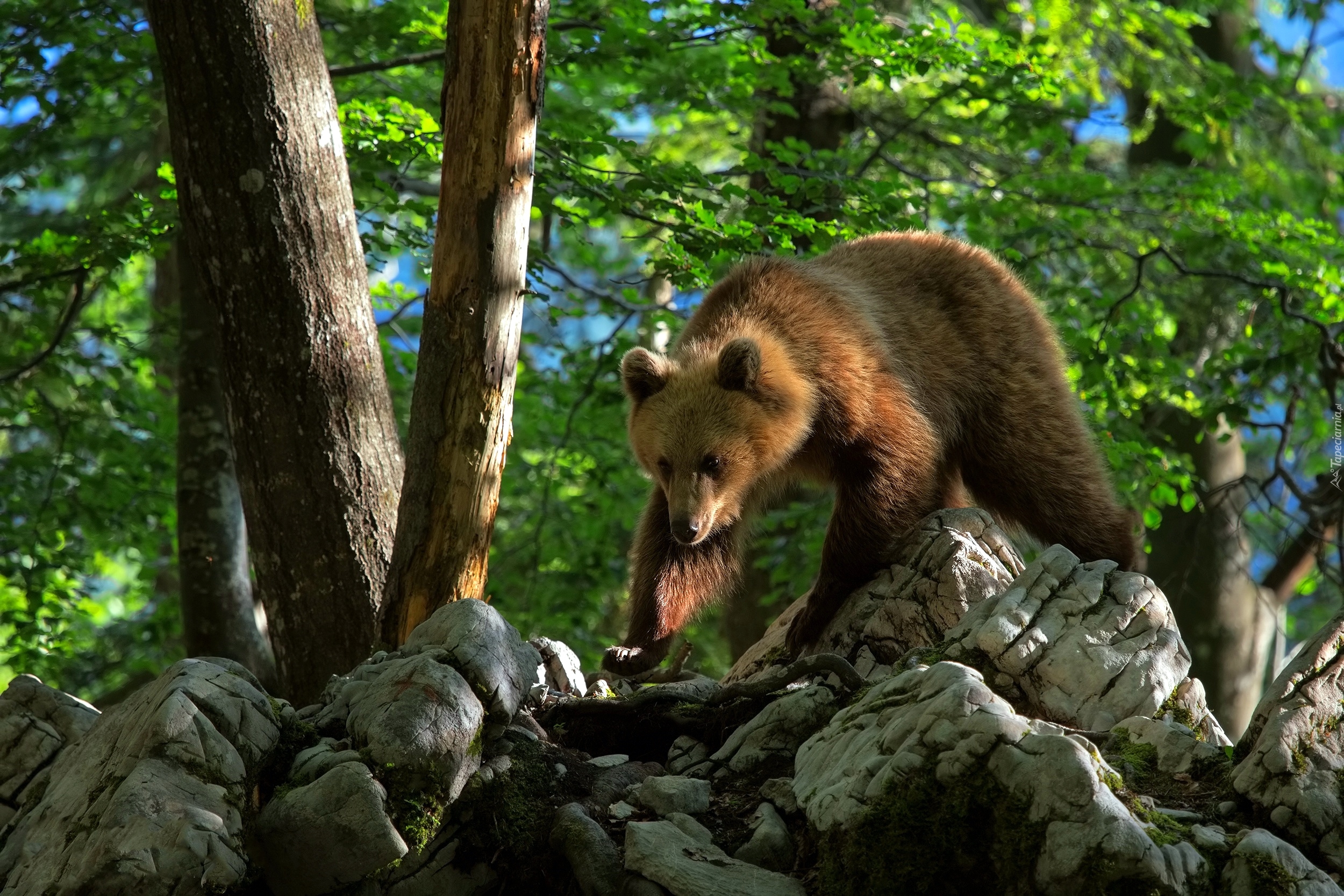 Edytor tapety: Niedźwiedź brunatny na skale obok drzew