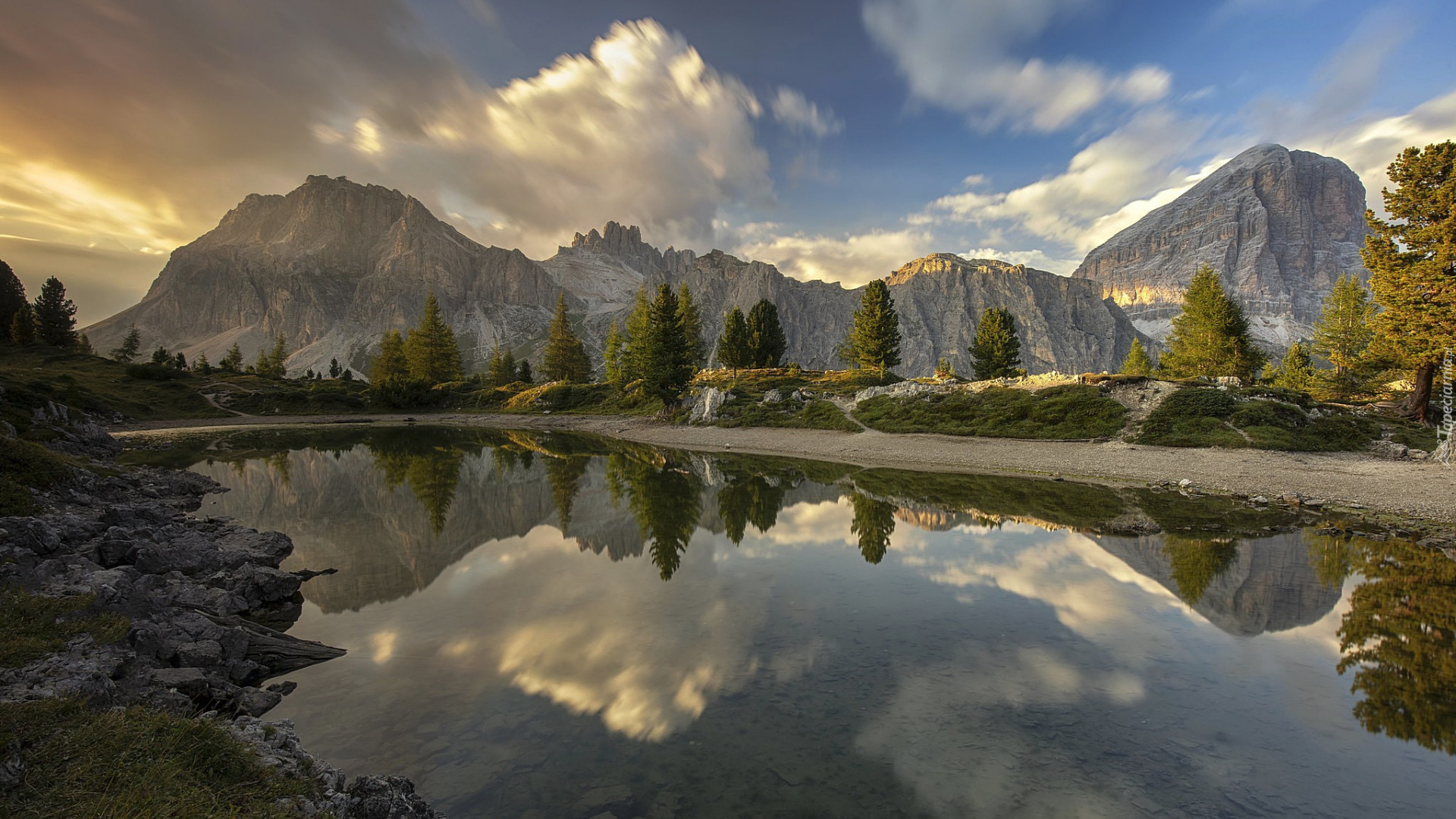 Edytor tapety: Odbicie drzew i gór w górskim jeziorze