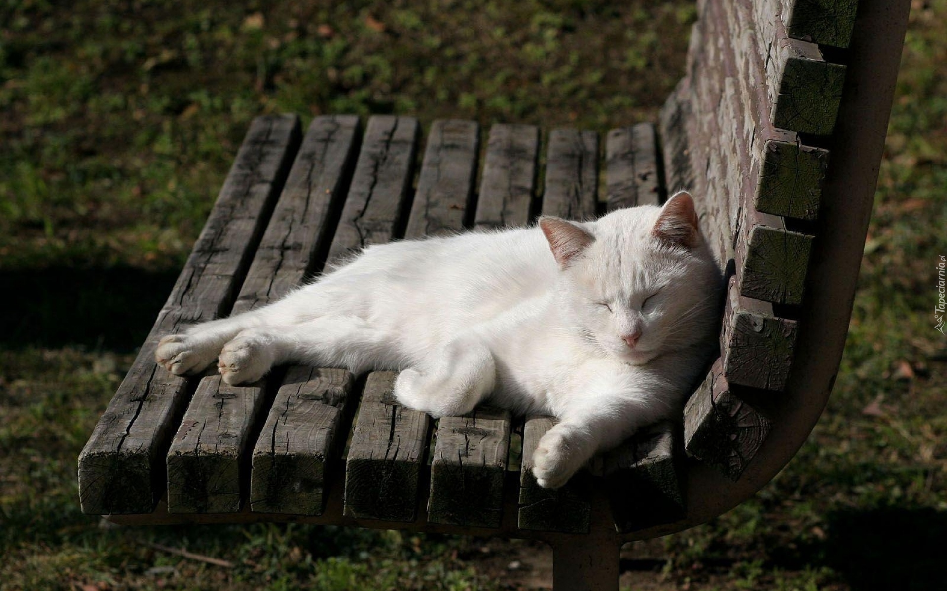 Edytor tapety: Biały kot śpiący na ławce