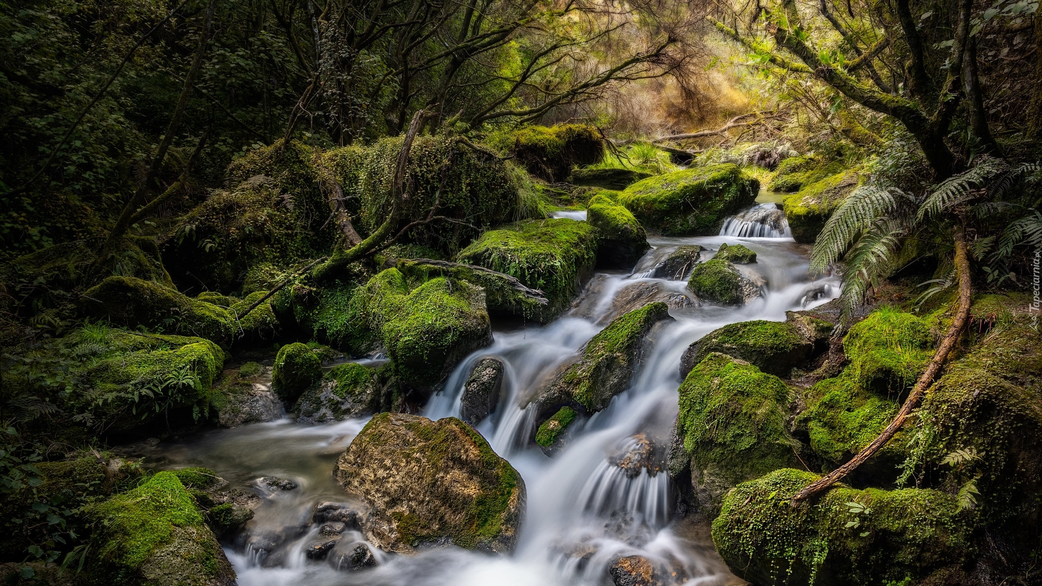 Edytor tapety: Leśna rzeka na omszałych kamieniach