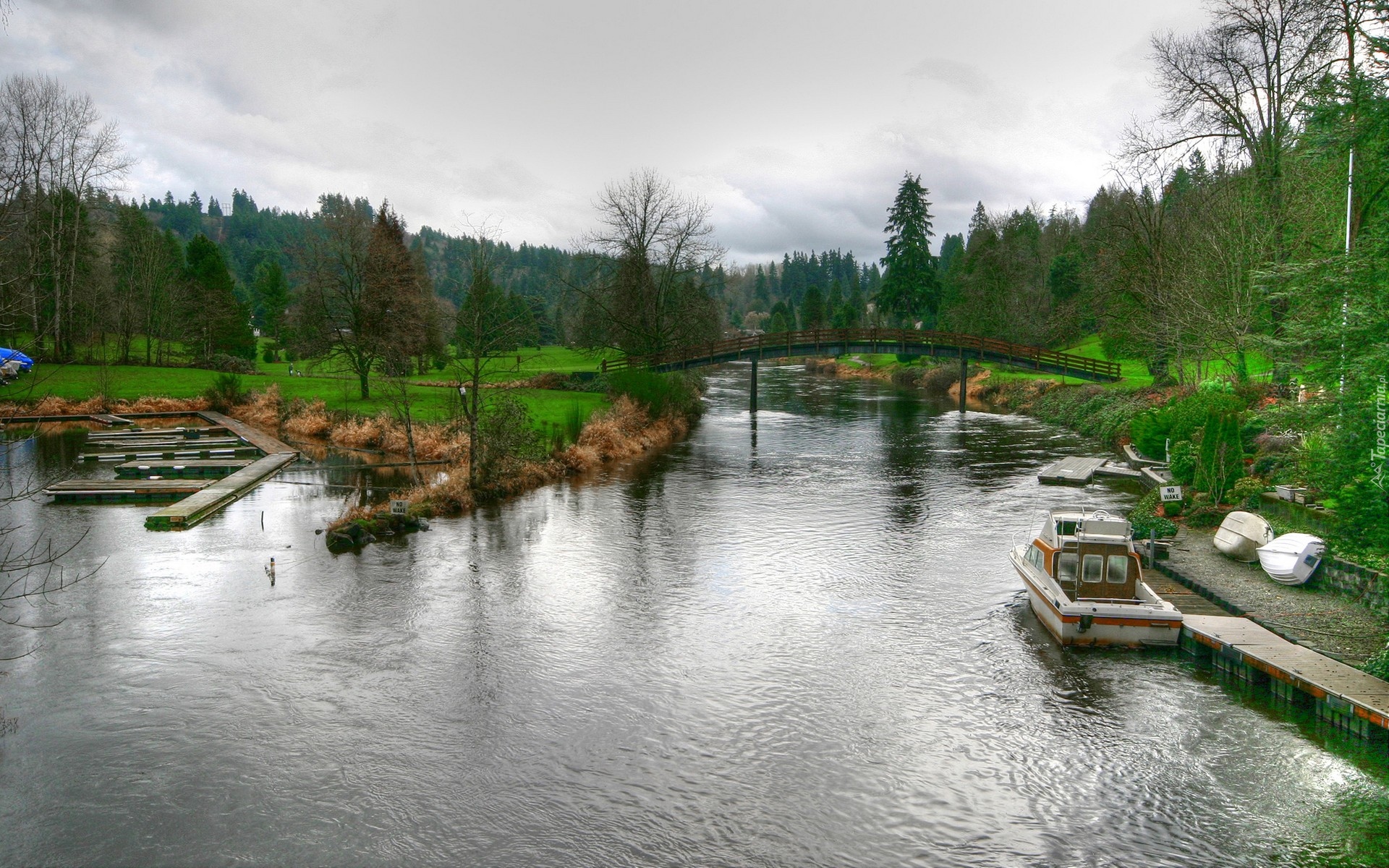Edytor tapety: Most obok przystani i łodzi na rzece
