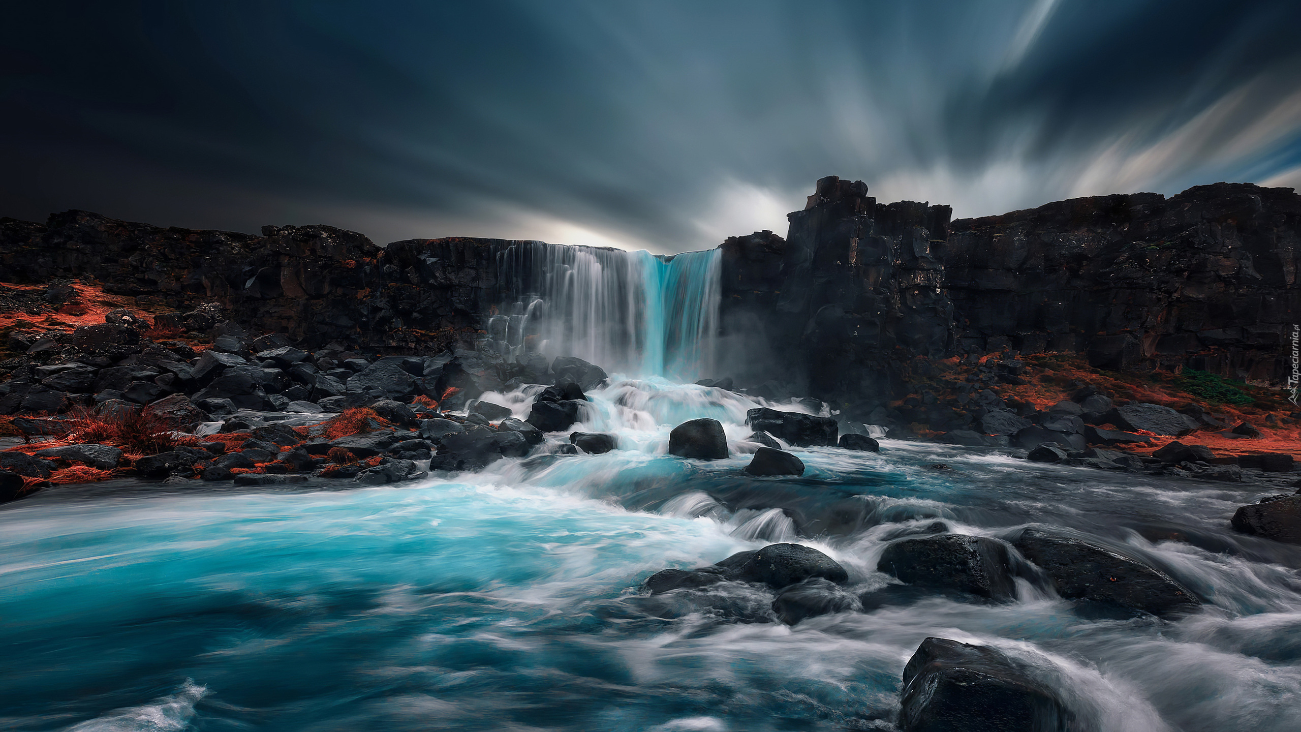 Edytor tapety: Wodospad spływający po skałach nad rzeką