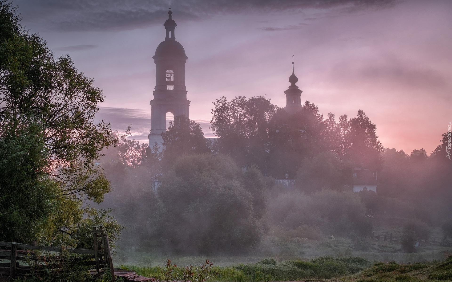 Edytor tapety: Cerkiew wśród drzew w porannej mgle