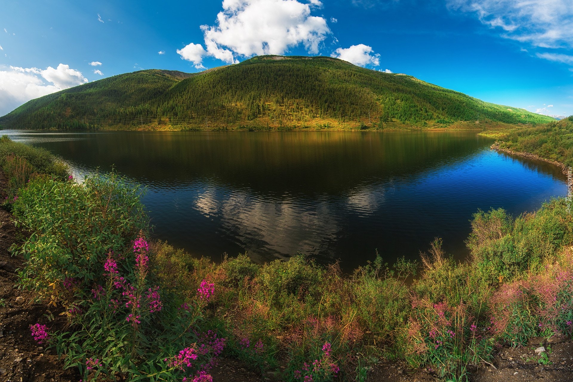 Edytor tapety: Kwiaty i zalesiona góra nad jeziorem