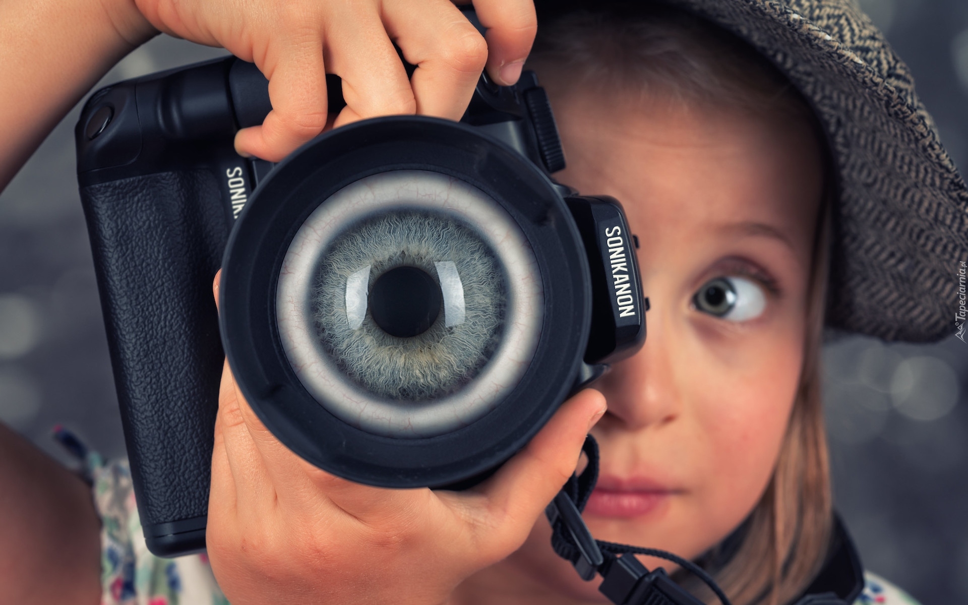 Edytor tapety: Dziewczynka i oko w obiektywie aparatu fotograficznego