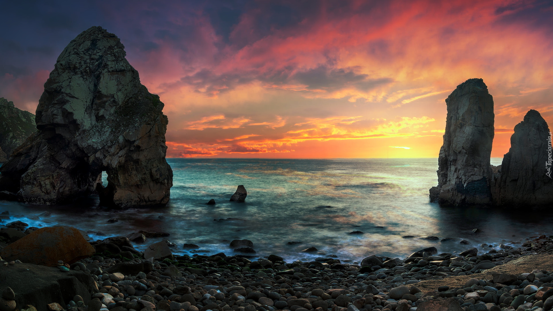 Edytor tapety: Skały nad morzem na tle zachodu słońca