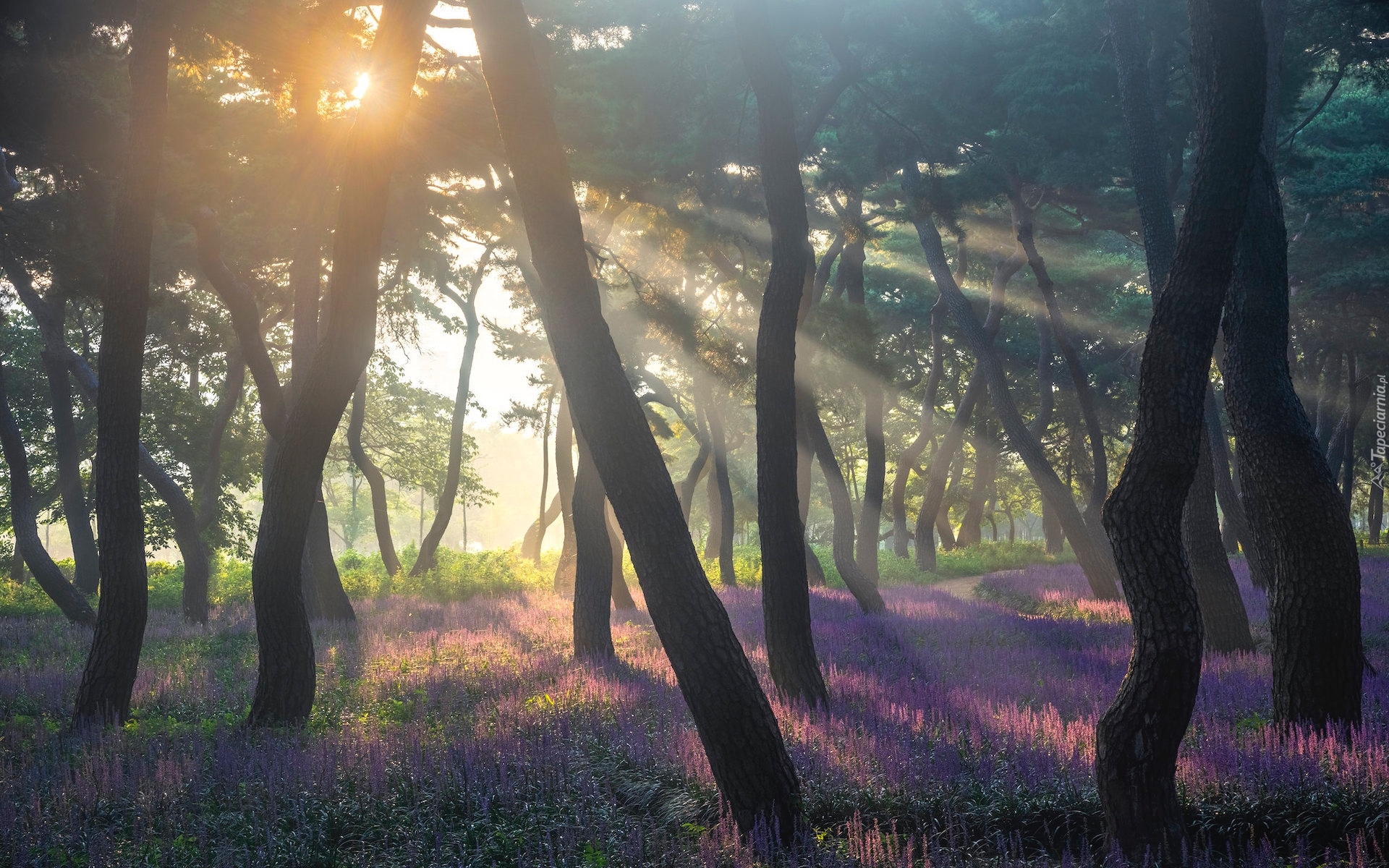 Edytor tapety: Fioletowe kwiaty pod drzewami w promieniach słońca
