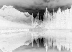 Edytor tapety: Oświetlony dom pod lasem nad jeziorem Emerald Lake