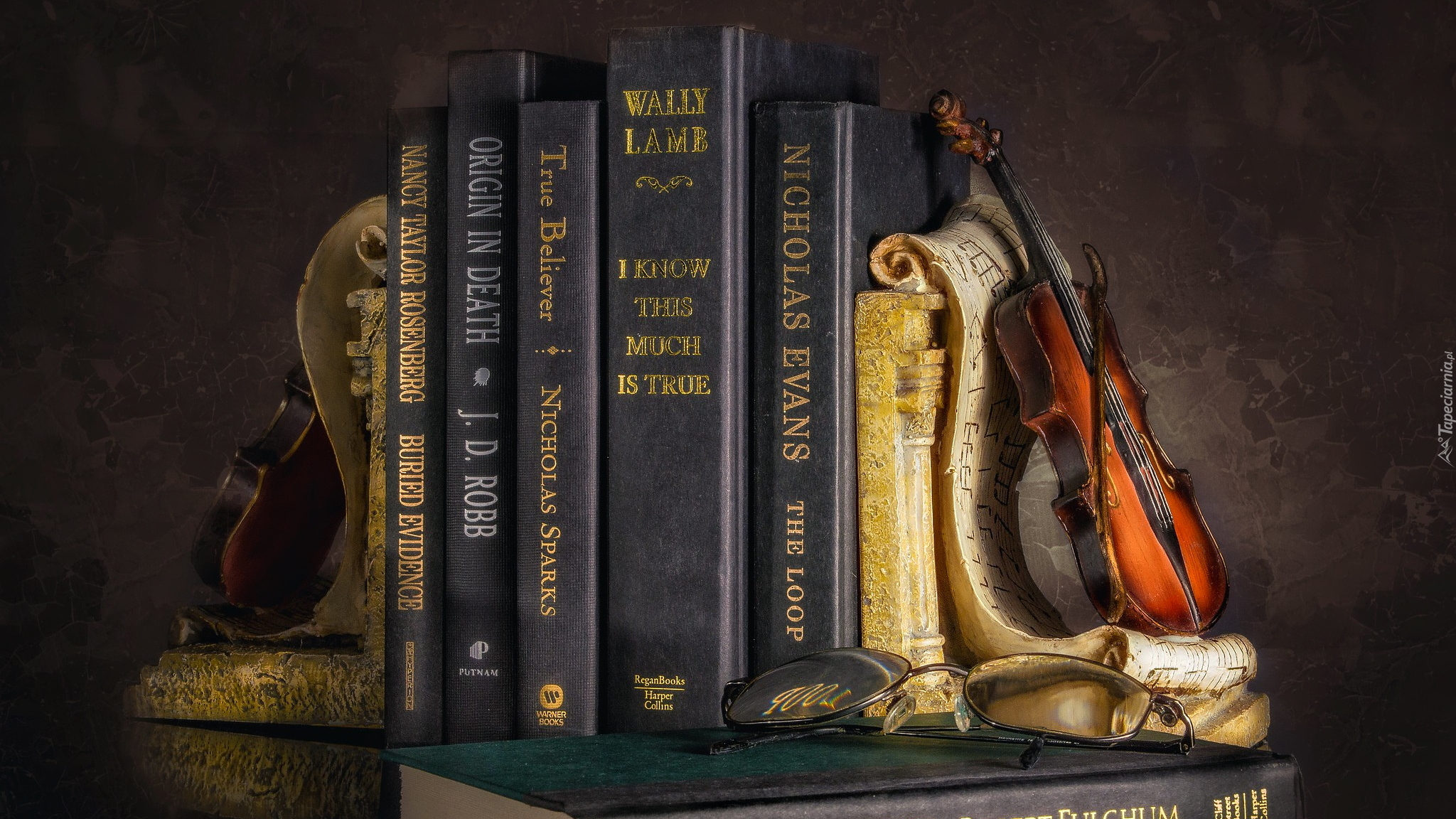 Edytor tapety: Książki pomiędzy podpórkami ze skrzypcami