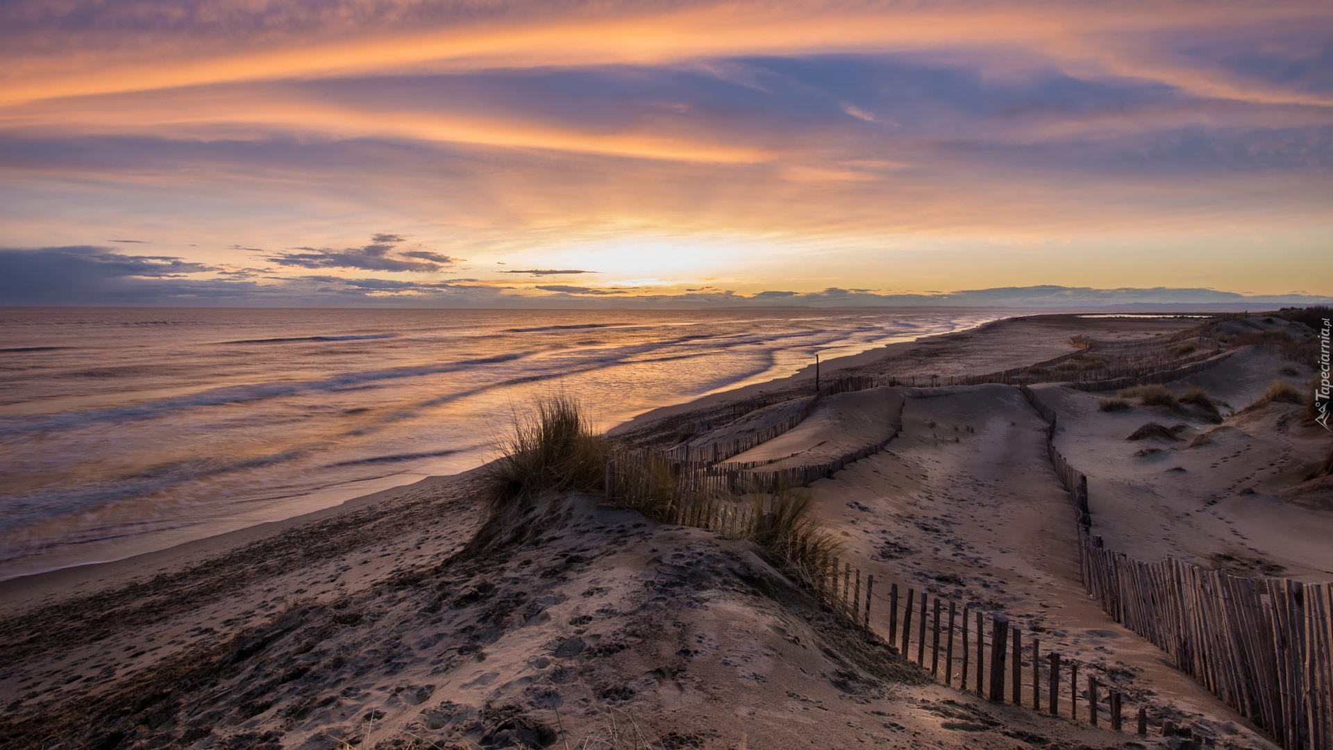 Edytor tapety: Kępki suchej trawy na plaży o wschodzie słońca