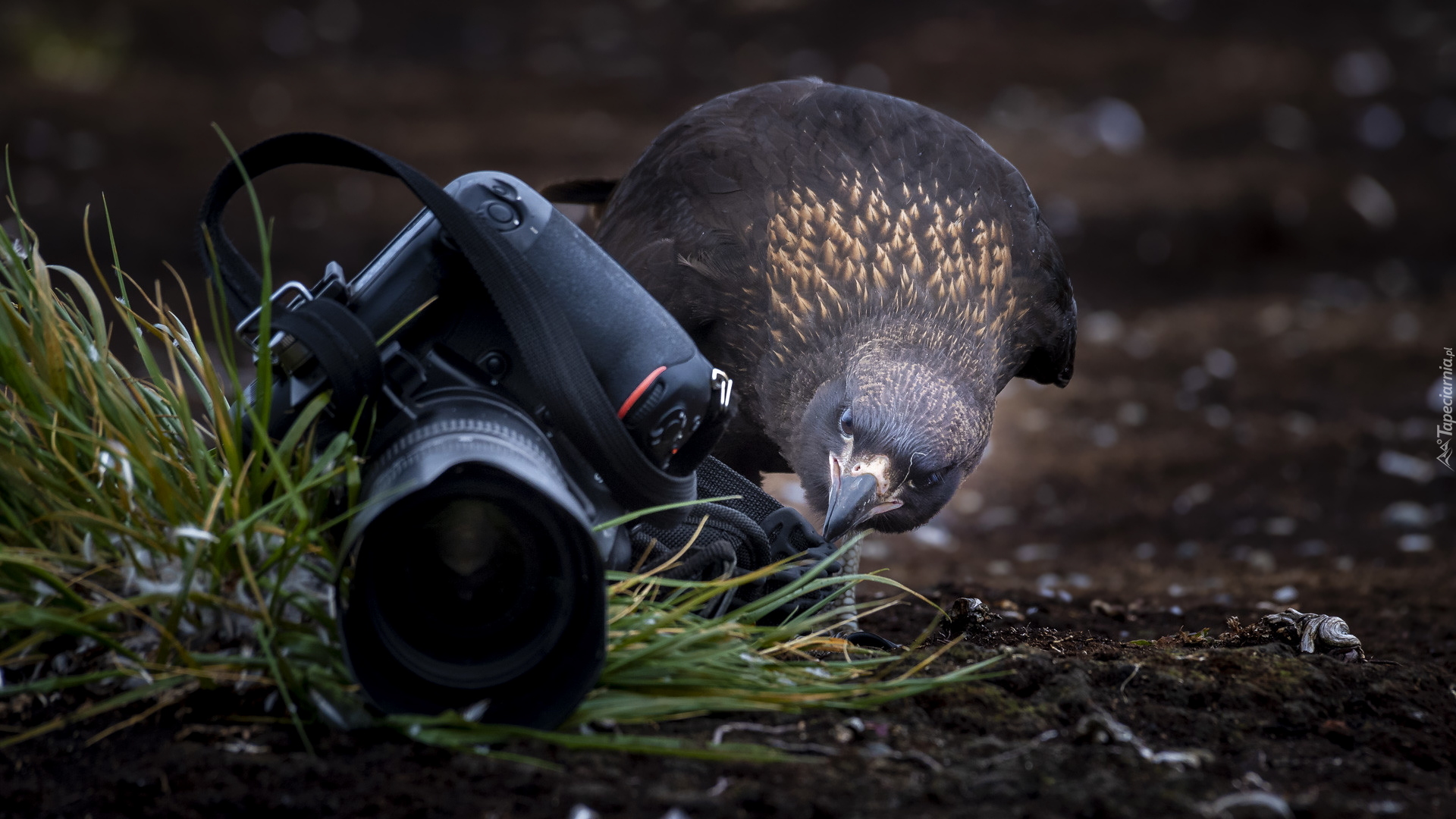 Edytor tapety: Karakara falklandzka obok aparatu fotograficznego