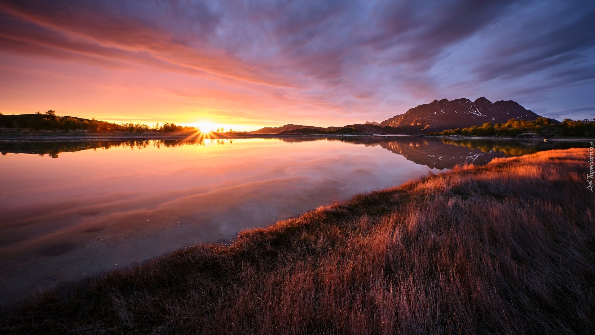 Edytor tapety: Rozświetlone wschodzącym słońcem trawy nad jeziorem