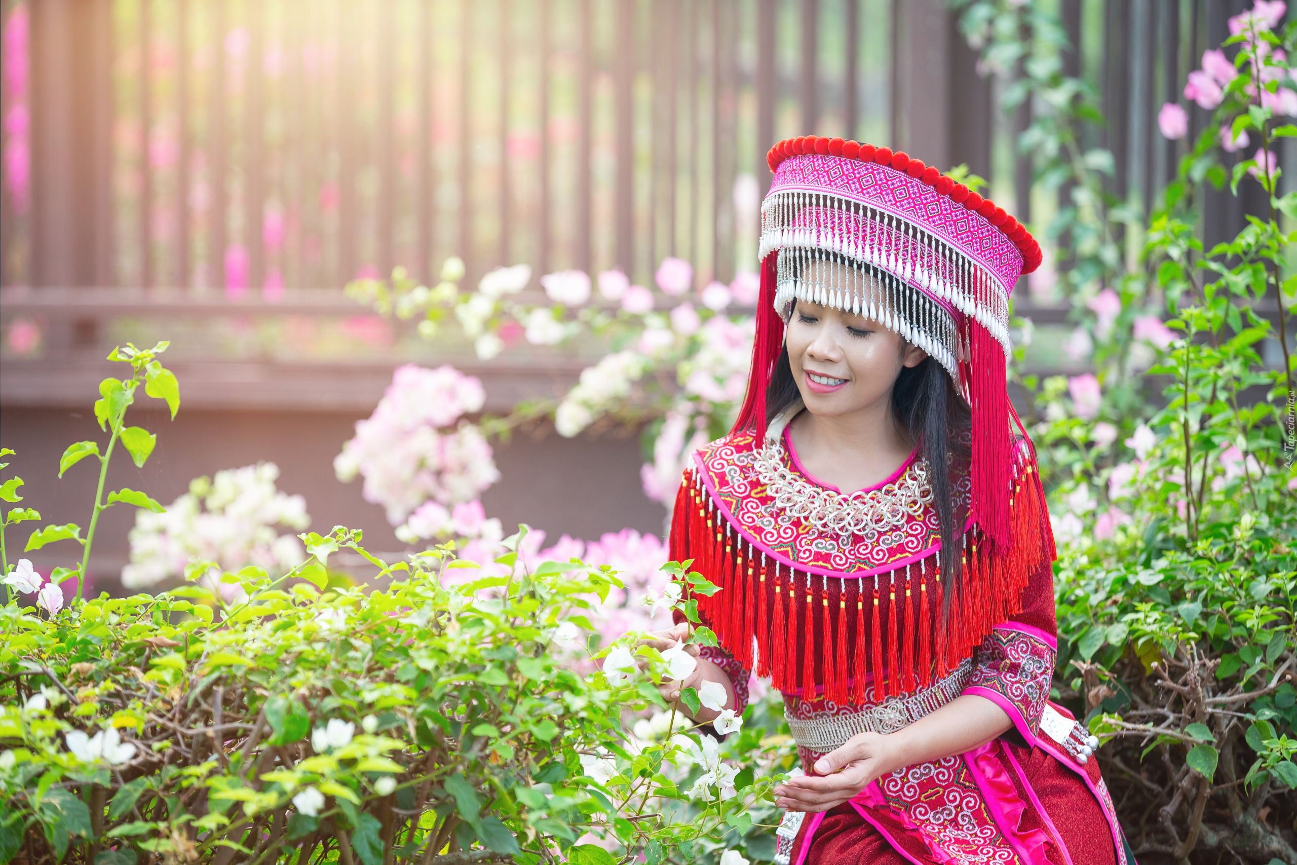 Edytor tapety: Azjatka w czerwonym tradycyjnym stroju w ogrodzie