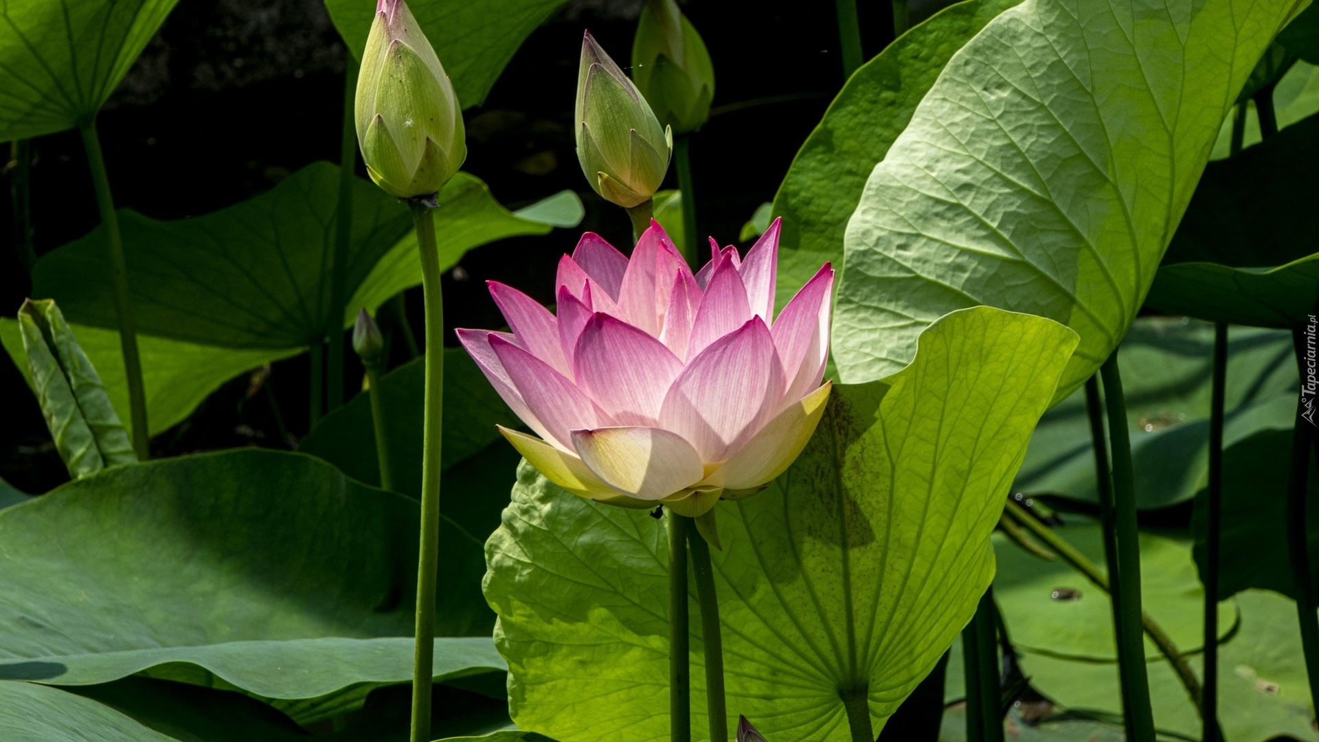 Edytor tapety: Różowy lotos z pąkami wśród liści