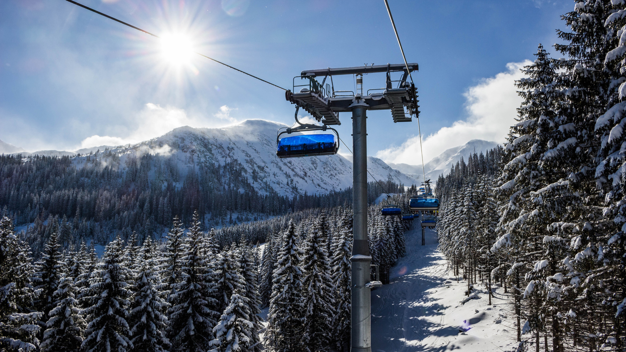 Edytor tapety: Wyciąg krzesełkowy nad ośnieżonym lasem w górach