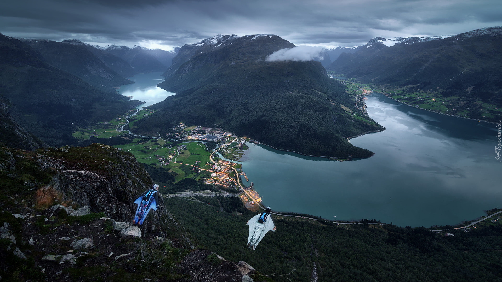 Edytor tapety: Szybujący wingsuiterzy nad górami i jeziorem