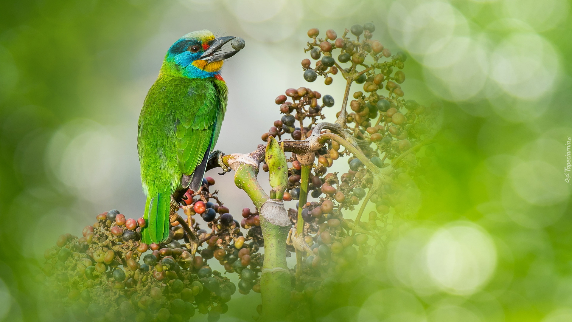 Edytor tapety: Pstrogłów tajwański z jagodą w dziobie