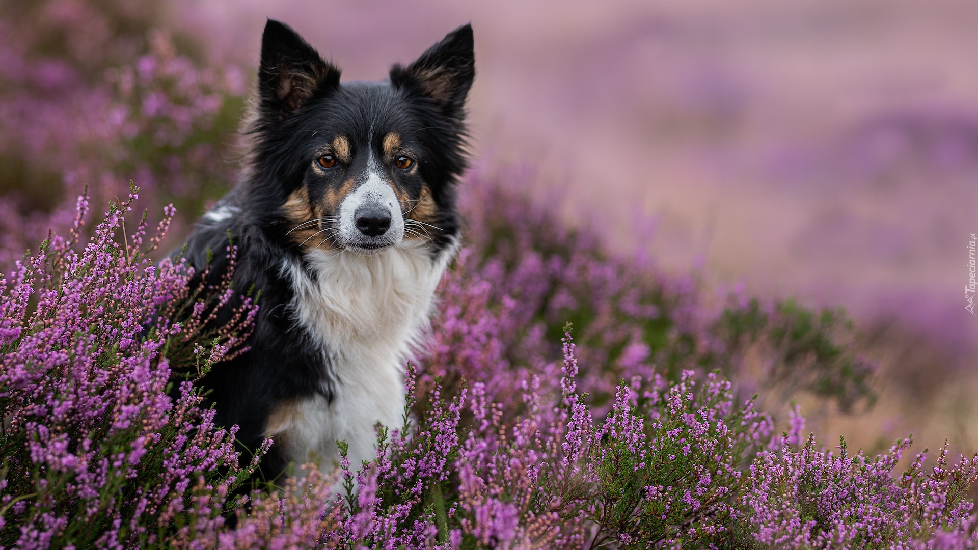 Edytor tapety: Border collie pośród fioletowych wrzosów