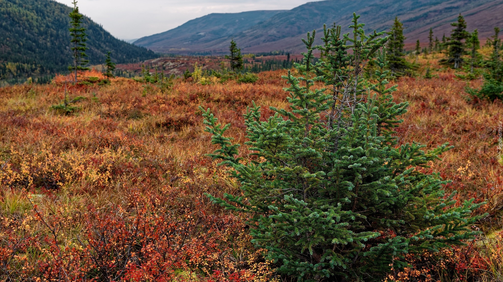 Edytor tapety: Zielone drzewka na łące z kolorową roślinnością