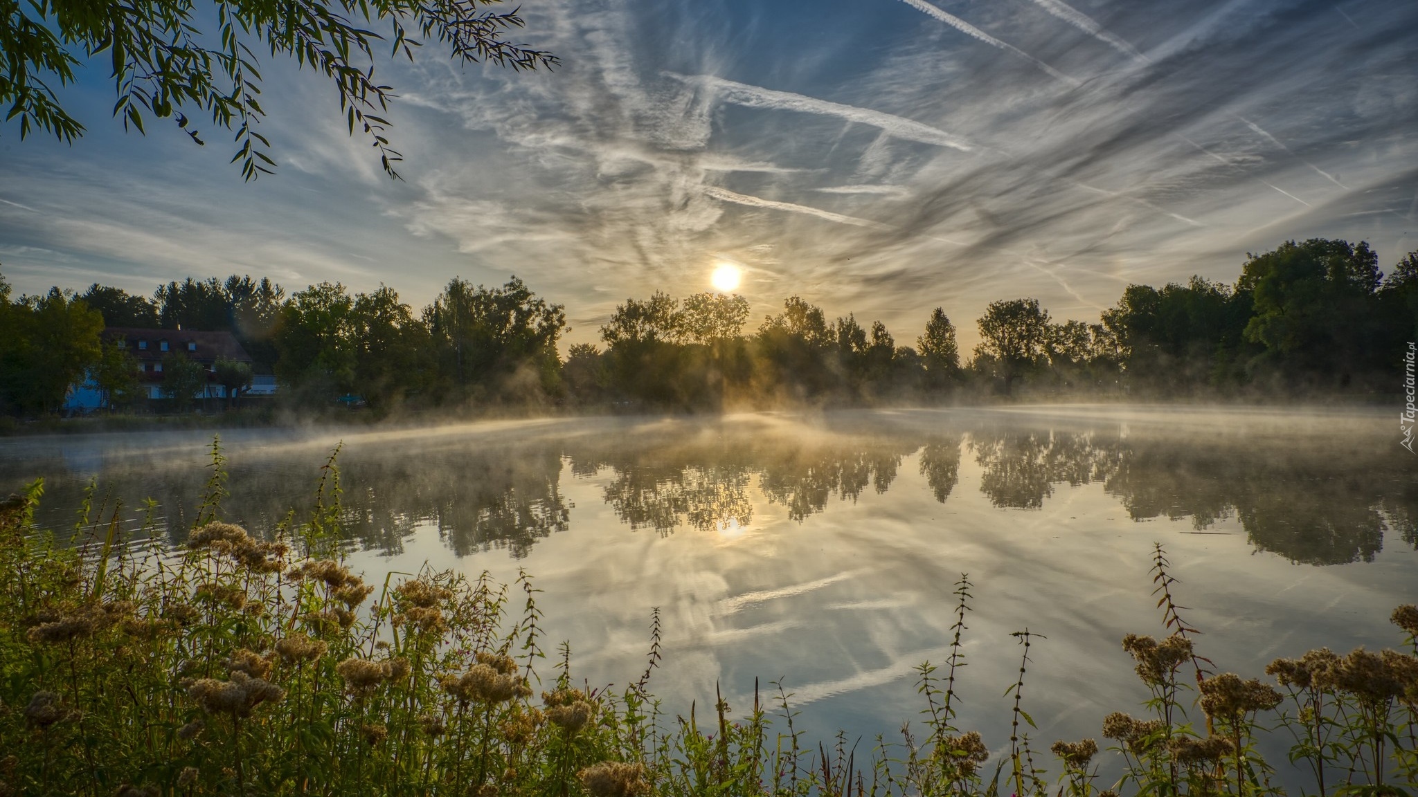 Edytor tapety: Wschód słońca nad zamglonym jeziorem