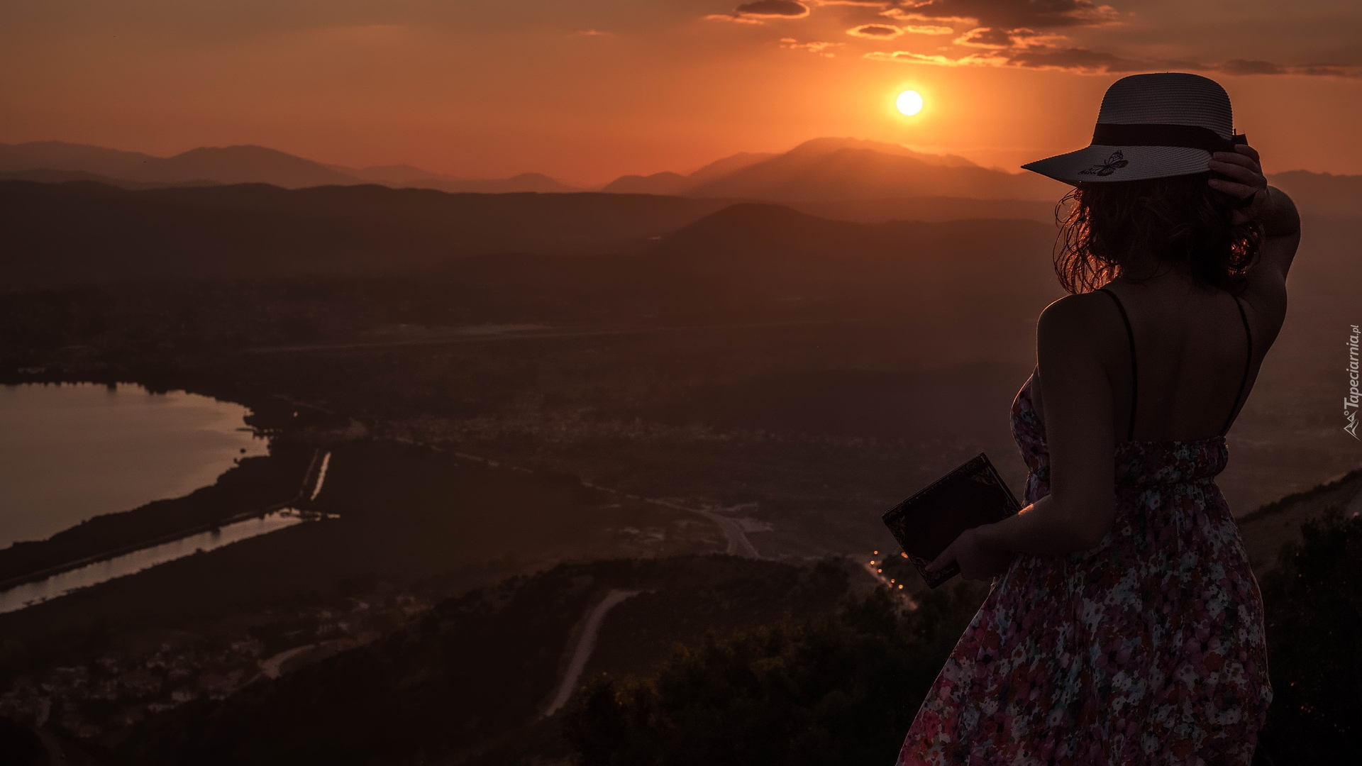 Edytor tapety: Kobieta w kapeluszu oglądająca zachód słońca nad górami