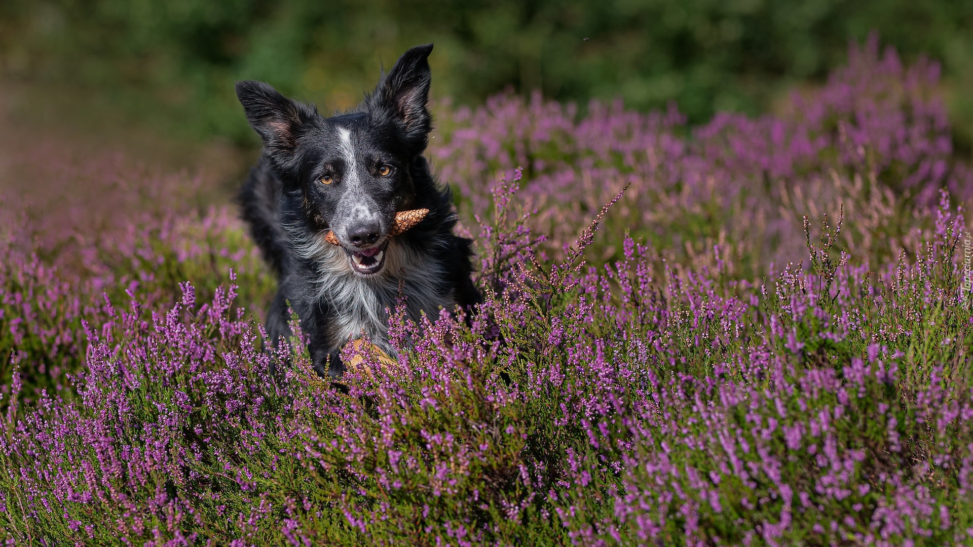 Edytor tapety: Border collie z szyszką w pysku we wrzosach